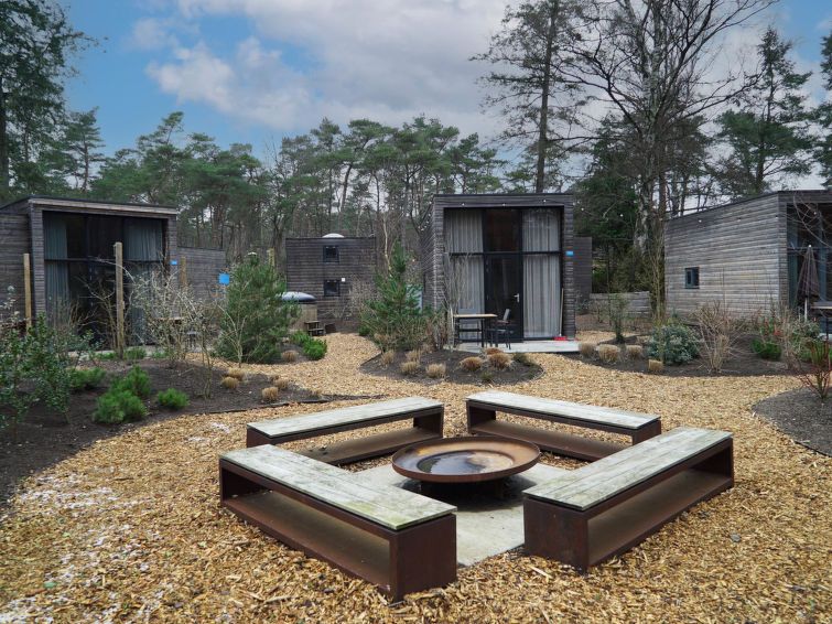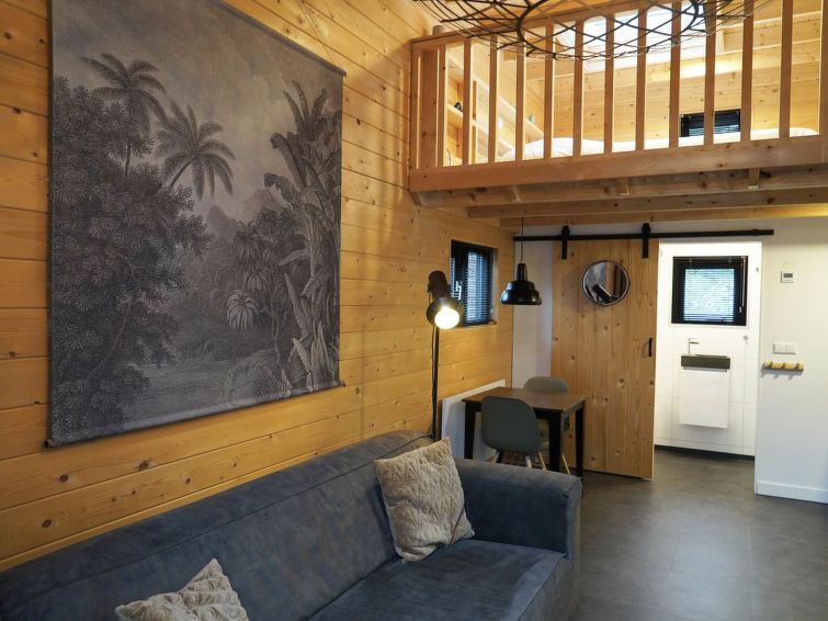 "Tiny House 2", 1-room chalet on 2 levels. Cosy furnishings: living/dining room with TV and wood-burning stove. Exit to the terrace. Kitchenette (2 induction hot plates, kettle, microwave, electric coffee machine). Shower/WC. Upper floor: (steep stair) open alcove, - 170 cm with rooflight with 1 double bed (2 x 80 cm, length 200 cm).
