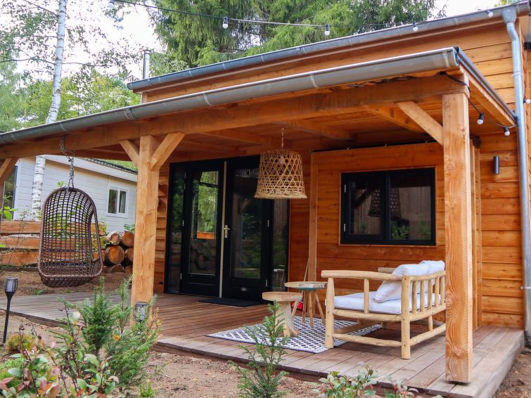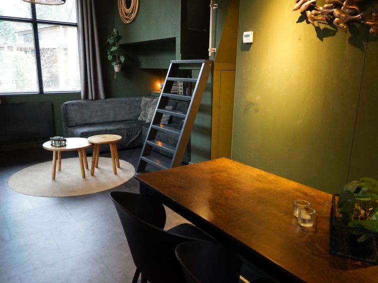 "Tiny House 4", 1-room chalet on 2 levels. Cosy furnishings: living/dining room with TV and wood-burning stove. Exit to the terrace. Kitchenette (2 induction hot plates, kettle, microwave, electric coffee machine). Shower/WC. Upper floor: (ladder) open small alcove with sloping ceilings, ceiling height 120 - 170 cm with 2 sleeping facilities.