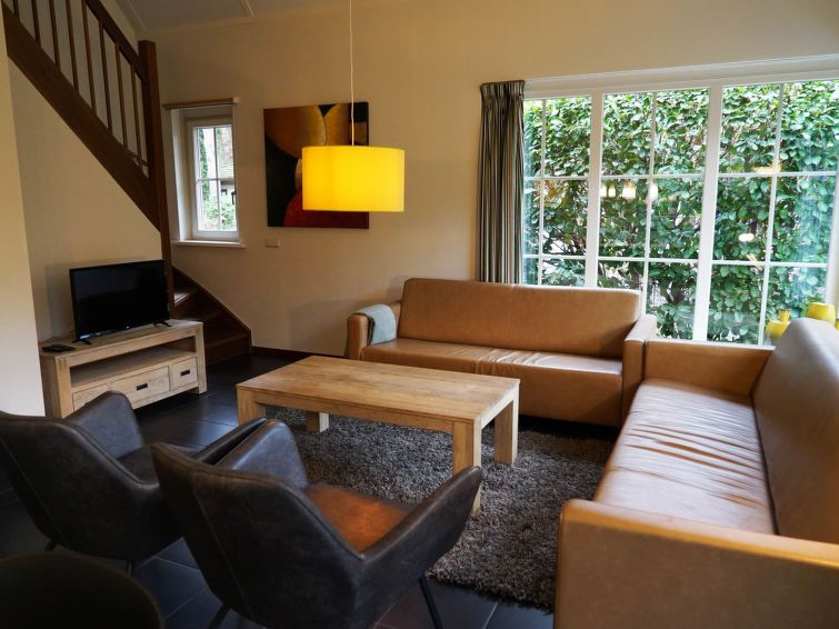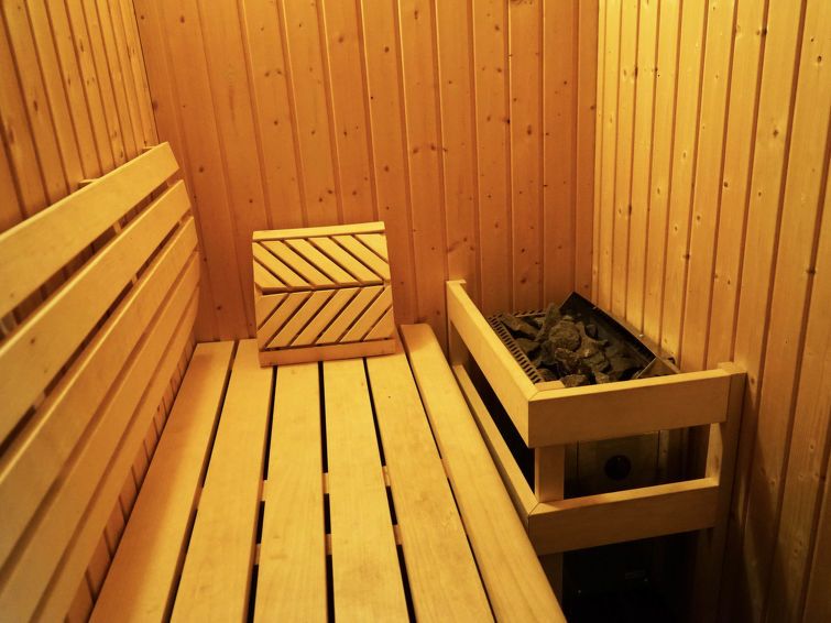 "Villa Sauna 6", 4-room house on 2 levels. Cosy furnishings: living/dining room with TV. Exit to the terrace. 1 room with 2 beds (80 cm, length 200 cm). Open kitchen (dishwasher, Gas stove, 4 gas rings, kettle, microwave, electric coffee machine). Bath or shower/WC. Upper floor: with sloping ceilings, 2 rooms, each room with 2 beds (80 cm, length 200 cm).