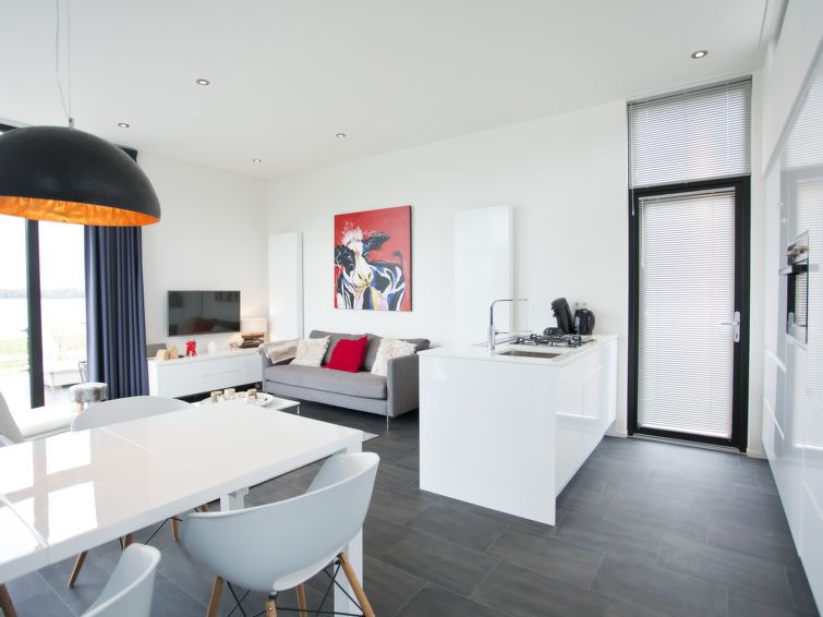 "Cube Exclusif 4", 3-room bungalow. Bright, comfortable and tasteful furnishings: living/dining room with dining table and TV. Exit to the terrace. 2 rooms, each room with 2 beds. Open kitchen (4 hot plates, dishwasher, kettle, freezer, electric coffee machine, combination microwave).