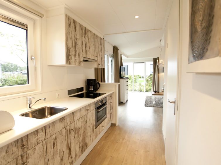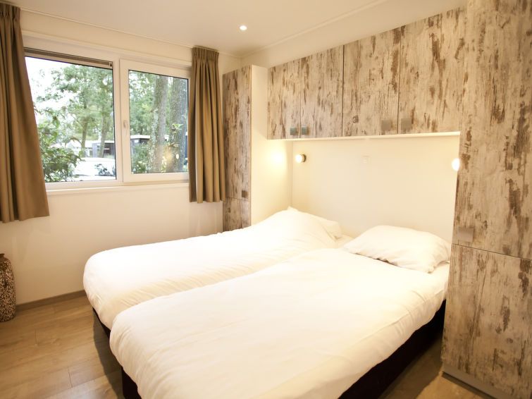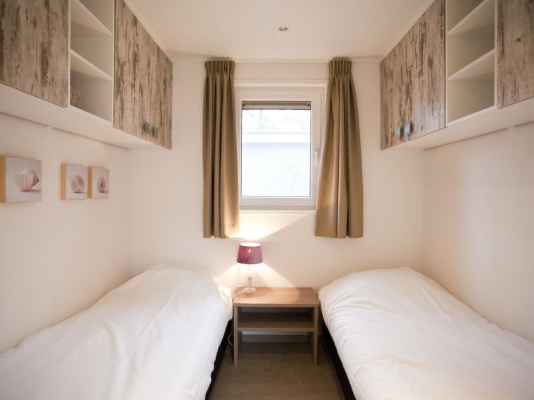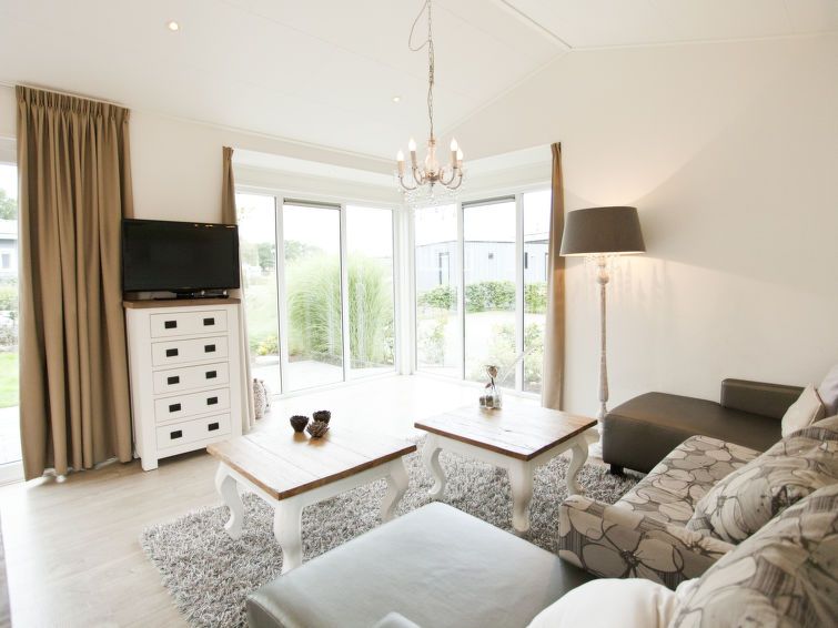 "Exclusif 4", 3-room bungalow. Bright, comfortable and tasteful furnishings: living/dining room with dining table and TV. Exit to the terrace. 2 rooms, each room with 2 beds. Open kitchen (dishwasher, 4 induction hot plates, kettle, electric coffee machine, combination microwave).