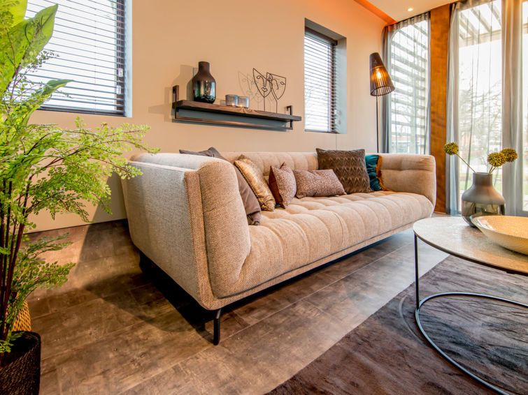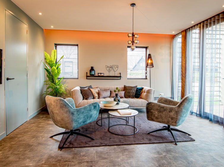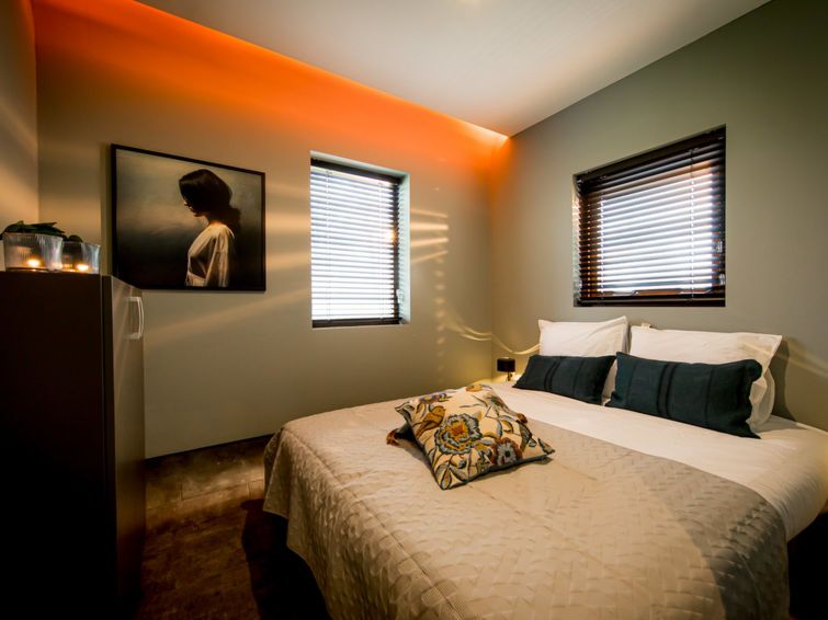 "Modus 4", 3-room bungalow. Bright, very comfortable and tasteful furnishings: living/dining room with dining table and TV. Exit to the terrace. 1 room with 2 beds. 1 room with 1 double bed. Open kitchen (dishwasher, 4 induction hot plates, kettle, electric coffee machine, Capsules for coffee machine (Senseo) extra, combination microwave).