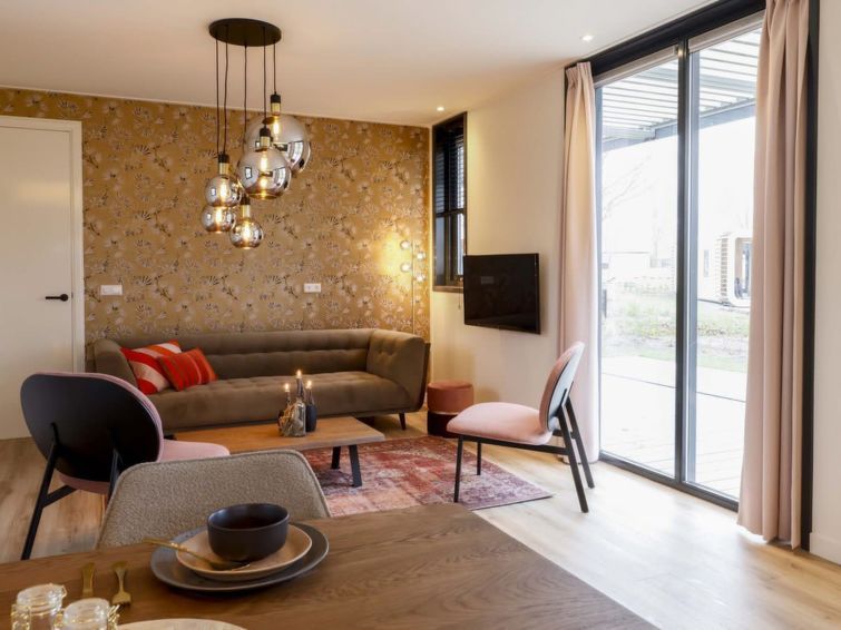 "Modus XL 4", 3-room bungalow. Bright, very comfortable and stylish furnishings: living/dining room with dining table and TV. Exit to the terrace. 2 rooms, each room with 2 beds. Open kitchen (4 hot plates, kettle, electric coffee machine, combination microwave). Shower, sep. WC. Floor heating.
