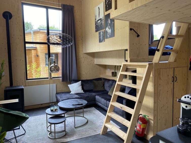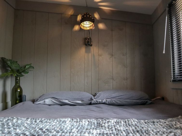 "Tiny House 4", 1-room mobile home on 3 levels. Simple and cosy furnishings: living/sleeping room with dining table and TV. Exit to the terrace. Small kitchenette (4 hot plates, kettle, electric coffee machine, combination microwave). Shower/WC. Upper floor: (ladder) open mezzanine with 1 double bed.