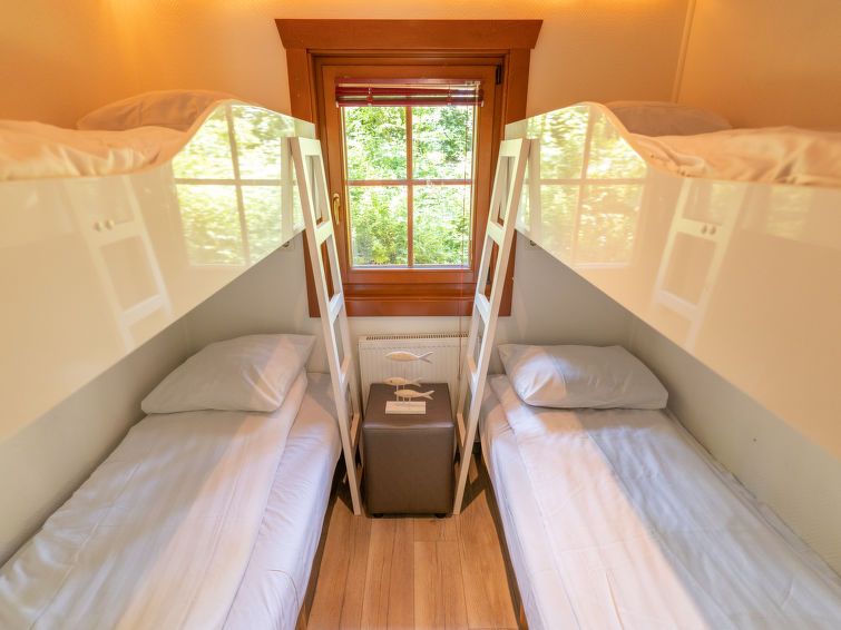 "Boekhorst 6", 3-room bungalow 50 m2. Cosy furnishings: living/dining room with dining table and TV. Exit to the terrace. 1 room with 2 beds. 1 room with 2 x 2 bunk beds. Open kitchen (4 hot plates, kettle, electric coffee machine, combination microwave). Shower/WC. Heating. Terrace.