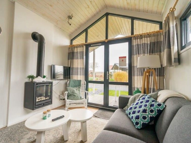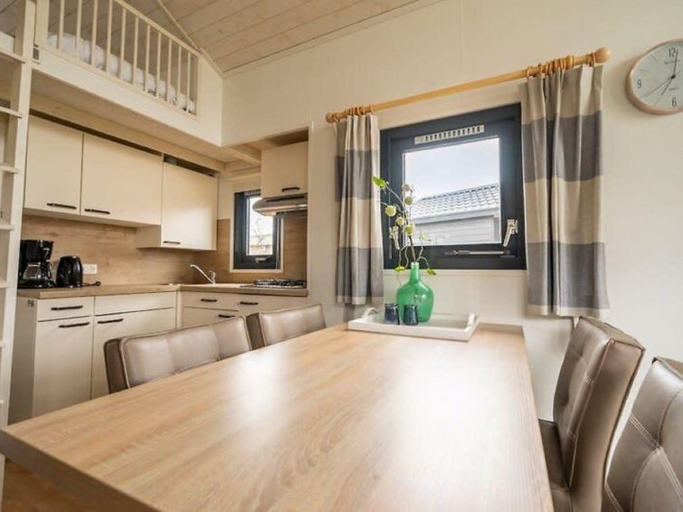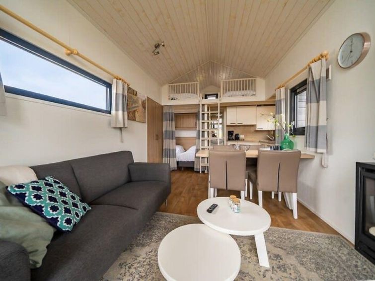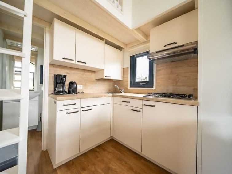 "Tiny Lodge 4", 3-room chalet 30 m2 on 2 levels. Comfortable furnishings: living/dining room with dining table, flat screen and gas heater. Exit to the terrace. 1 open double bedroom with curtain with 2 beds. Open kitchen (4 hot plates, electric coffee machine). Shower/WC. Upper floor: (ladder) mezzanine with 2 beds.