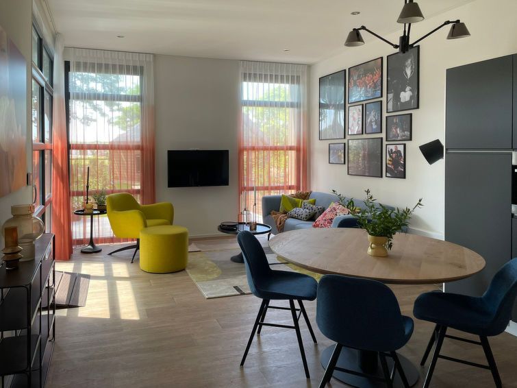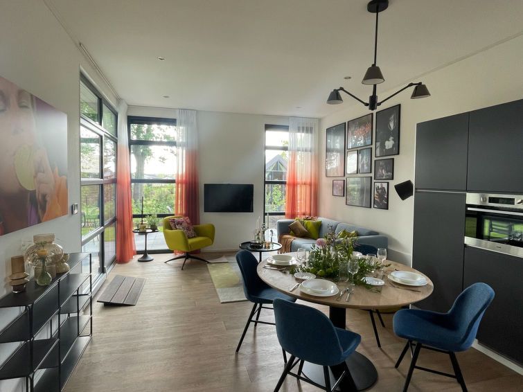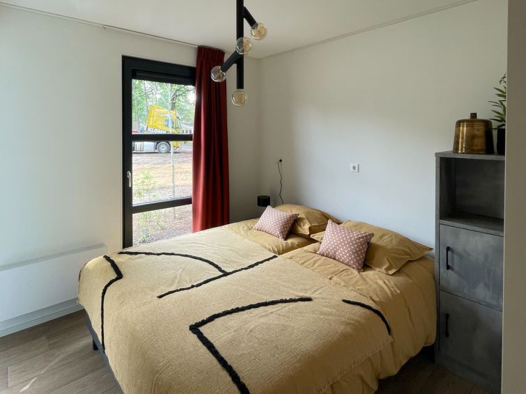 "L-Cube MIVA 4", 3-room house 70 m2, on the ground floor. Cosy furnishings: living/dining room with open-hearth fireplace (only for decoration), dining table and TV. Exit to the terrace. 1 room with 1 double bed and shower/WC. 1 room with 1 double bed. Open kitchen (dishwasher, kettle, electric coffee machine, combination microwave).