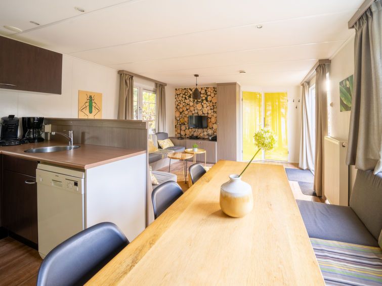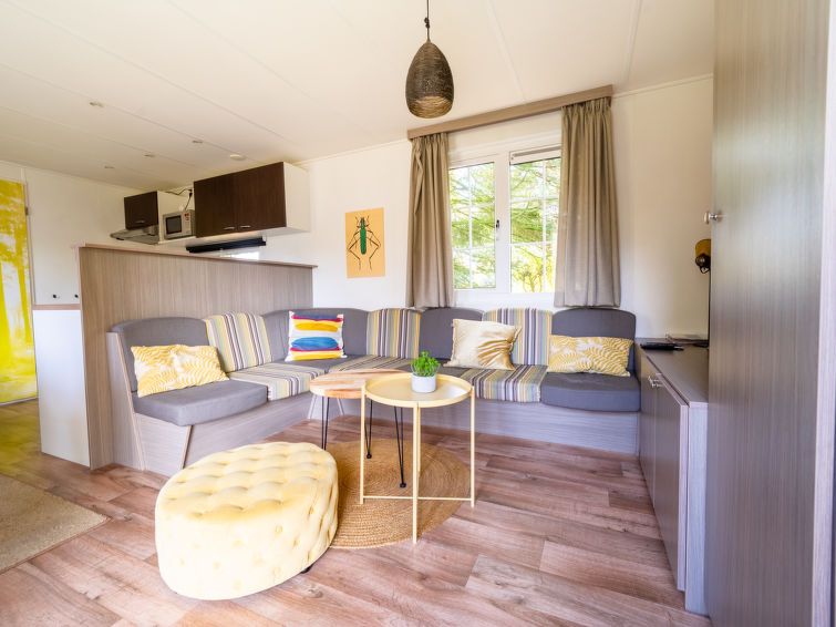 "Mobilehome 6", 4-room mobile home. Comfortable furnishings: living/dining room with dining table and digital TV. Exit to the terrace. 1 double bedroom with 1 double bed. 1 double bedroom with 2 beds. 1 double bedroom with 1 x 2 bunk beds. Open kitchen (4 hot plates, dishwasher, microwave, electric coffee machine, Capsules for coffee machine (Nespresso) extra).