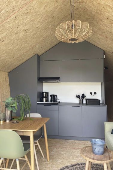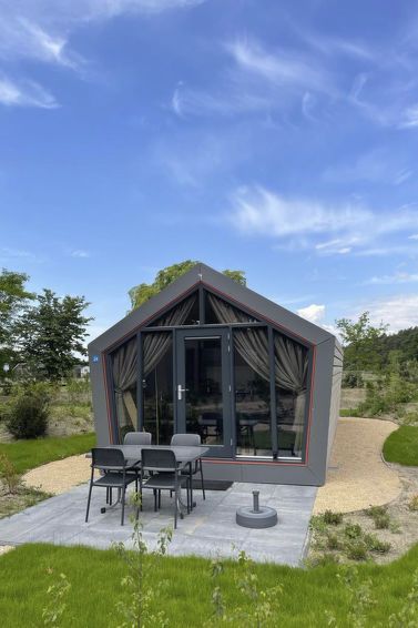 "Tiny House Solo Retreat 4", 3-room bungalow on the ground floor. Practical furnishings: living/dining room with dining nook and TV. 2 rooms, each room with 2 beds. Kitchenette (electric coffee machine). Shower/WC. Electric heating. Terrace. Terrace furniture. Facilities: Internet (WiFi).
