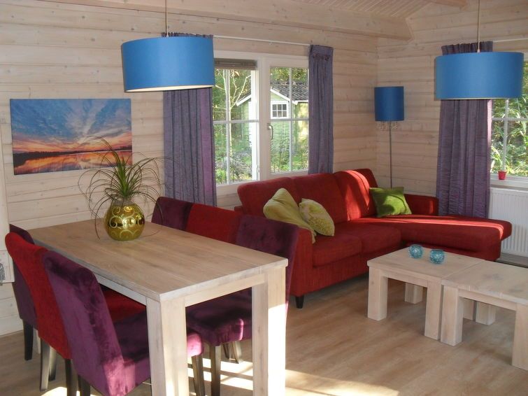 "Fin Maison 6", 4-room bungalow 55 m2. Cosy and wooden furniture furnishings: living/dining room with dining table and TV. Exit to the terrace. 1 room with 1 double bed. 1 room with 2 beds and 1 x 2 bunk beds. Open kitchen (dishwasher, kettle, freezer, combination microwave). Shower/WC.