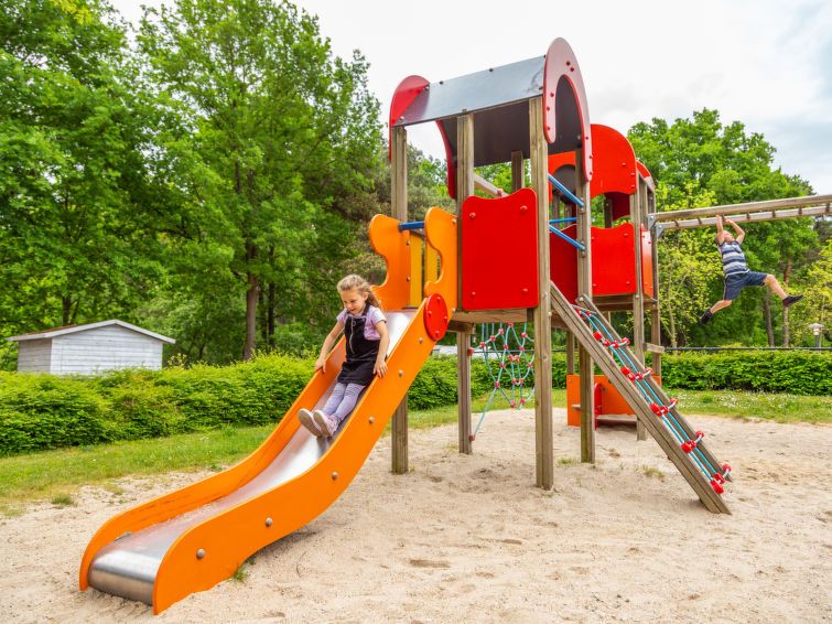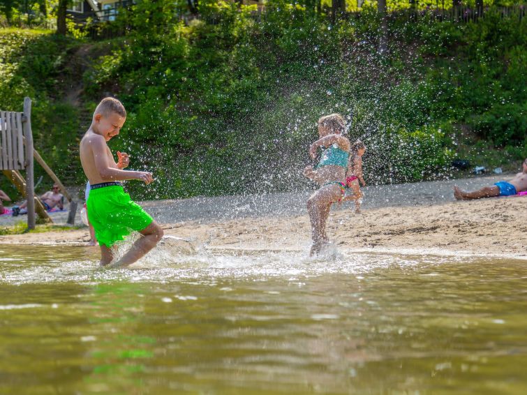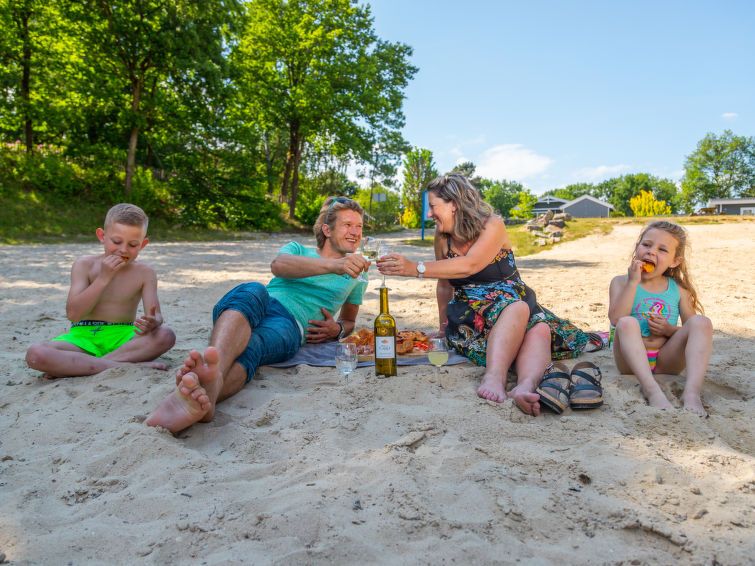 "L-Cube Sauna 4", 3-room bungalow. Beautiful and modern furnishings: living/dining room with dining table and TV. Exit to the terrace. 1 room with 1 double bed. 1 room with 2 beds. Open kitchen (dishwasher, kettle, freezer, combination microwave). Shower/WC, Sauna. Electric heating.