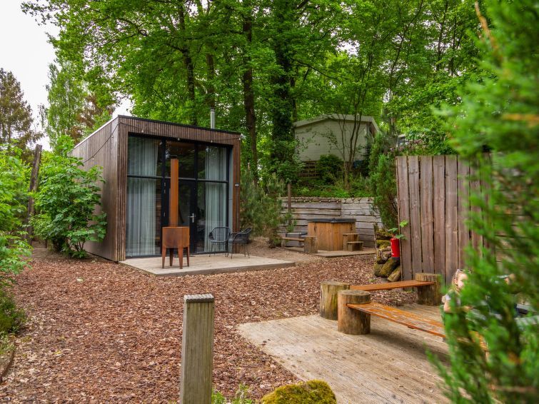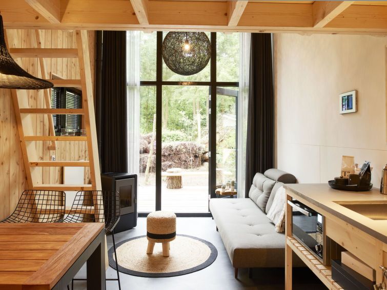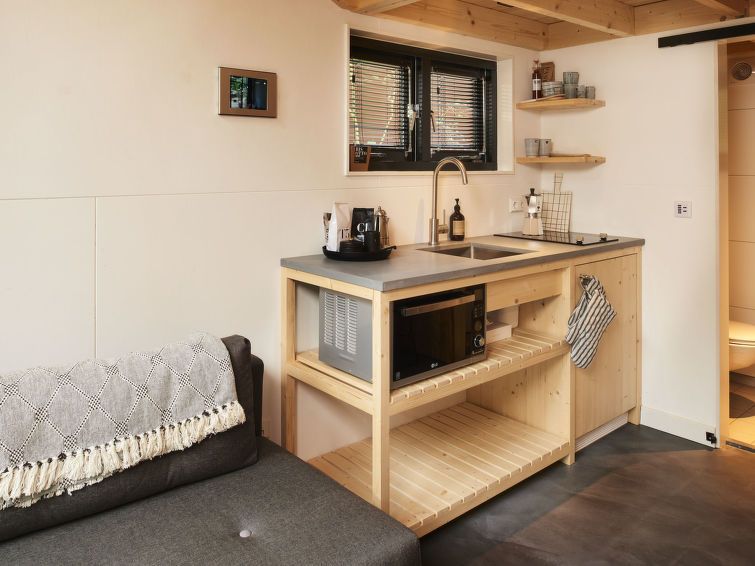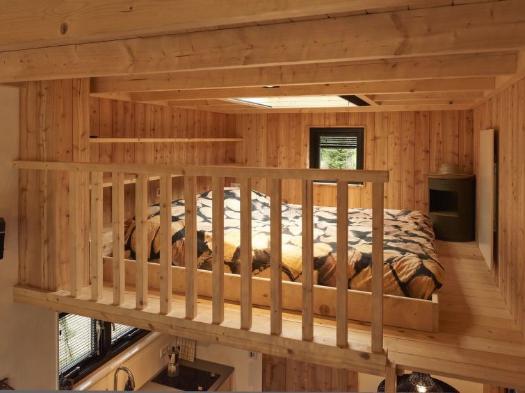 "Tiny House 2", 1-room mobile home 28 m2. Beautiful furnishings: living/dining room with Scandinavian wood stove, dining table and TV. Exit to the terrace with 1 double bed. Kitchenette (2 induction hot plates, kettle, combination microwave). Shower/WC. Electric heating. Upper floor: gallery.