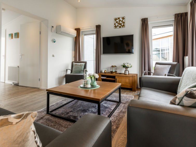 "Schaelsbergerbosch+", 4-room chalet 75 m2. Comfortable and stylish furnishings: entrance hall with separate WC. Open living/dining room with dining table, international TV channels, flat screen and air conditioning. 2 double bedrooms, each room with 2 beds and flat screen. 1 double bedroom with 1 x 2 bunk beds.