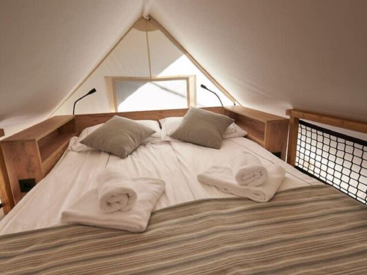 "Lodge de Montagne (glamping tent)", 3-room bungalow on the ground floor. Comfortable furnishings: open living/dining room. 1 double bedroom with 1 double bed and flat screen. Kitchenette (electric coffee machine) with dining table. Shower/WC. No heating option. Upper floor: (open staircase), 1 double bedroom with 1 double bed.