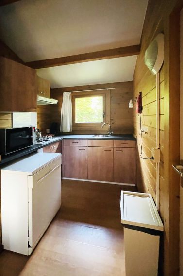 "Fins 6 personen", 4-room chalet 70 m2. Comfortable furnishings: entrance hall with separate WC. Living/dining room with dining table and flat screen. Exit to the terrace. 1 double bedroom with 1 double bed. 2 double bedrooms, each room with 2 beds. Open kitchen (dishwasher, 4 gas rings, kettle, microwave, electric coffee machine).