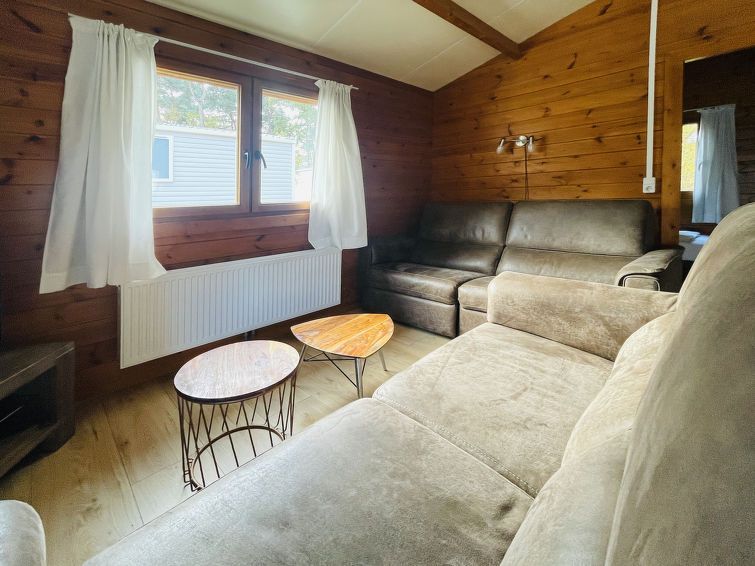 "Fins 4 personen", 3-room chalet 70 m2. Comfortable furnishings: entrance hall with separate WC. Living/dining room with dining table and flat screen. Exit to the terrace. 1 double bedroom with 1 double bed. 1 double bedroom with 2 beds. Open kitchen (dishwasher, 4 gas rings, kettle, microwave, electric coffee machine).