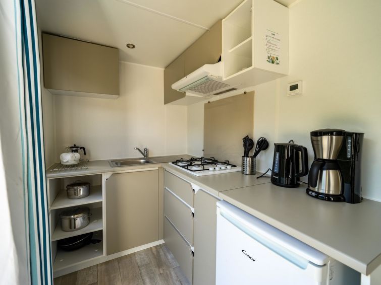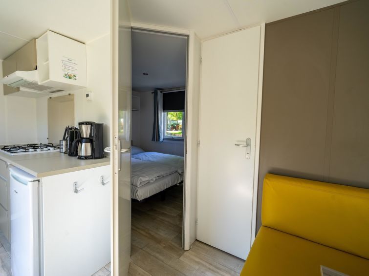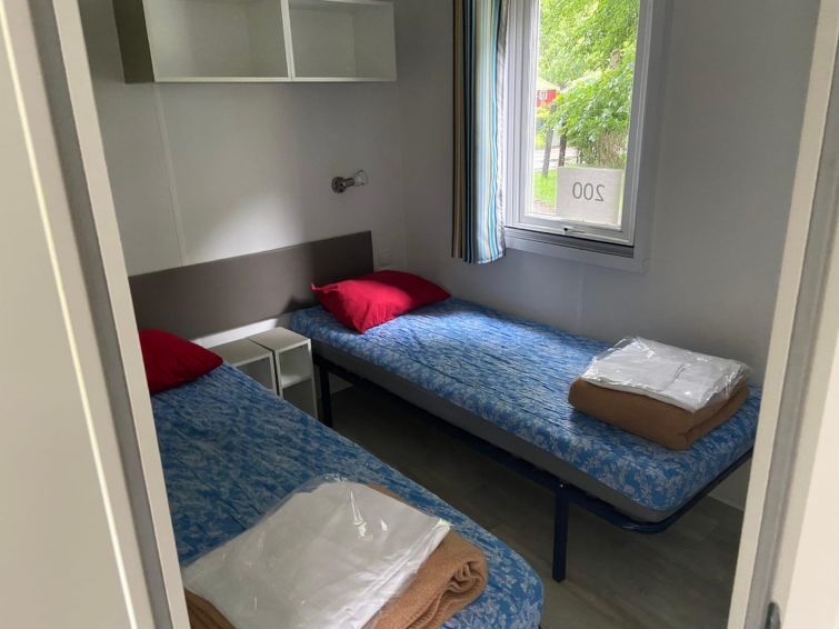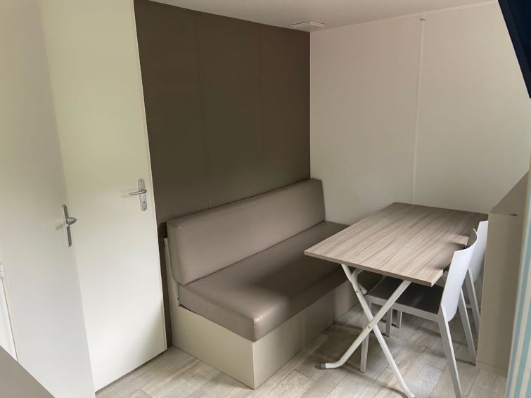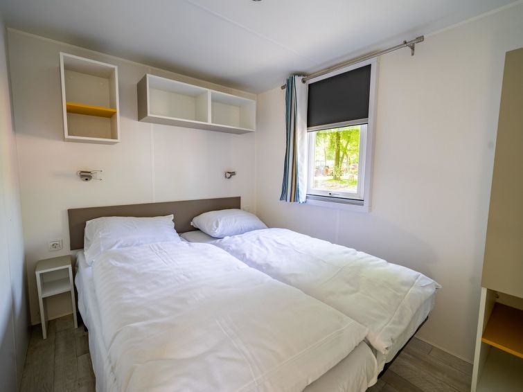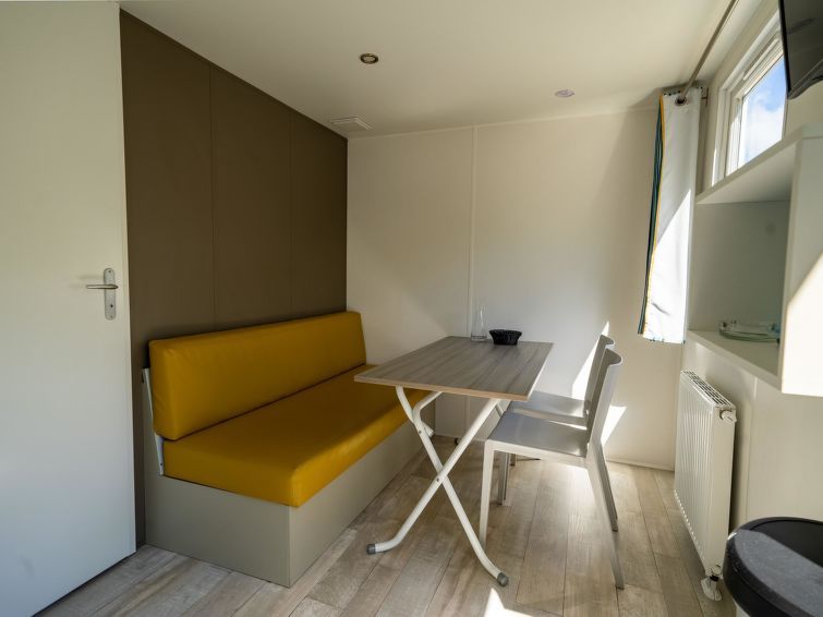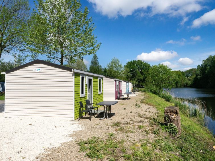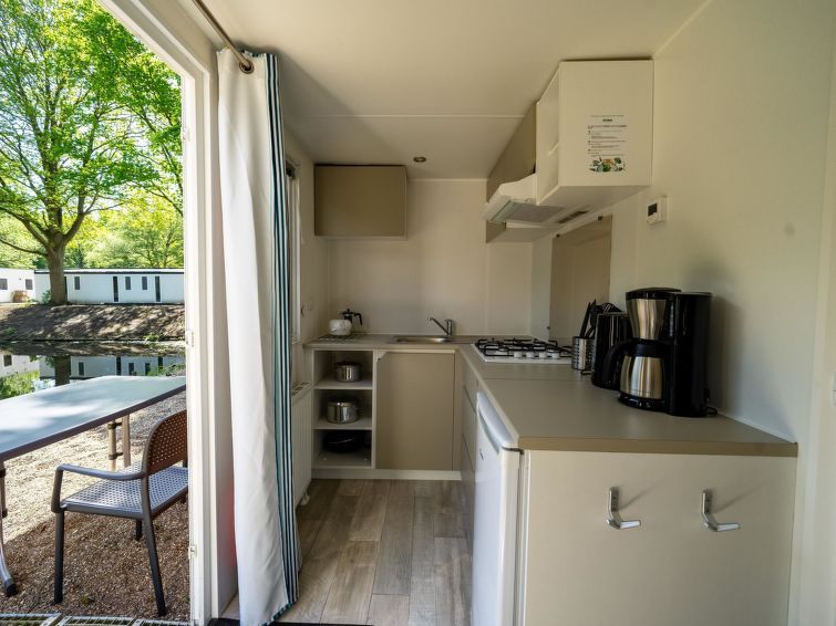 "Berkel 2", 2-room house. Simple furnishings: living/dining room with dining table and TV. Exit to the terrace. 1 small room with 2 beds. Open kitchen (kettle, electric coffee machine). Shower, sep. WC. Heating. Terrace. Terrace furniture. Facilities: children's high chair, baby cot.