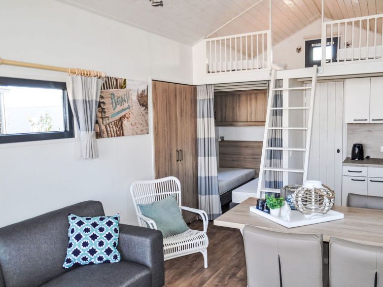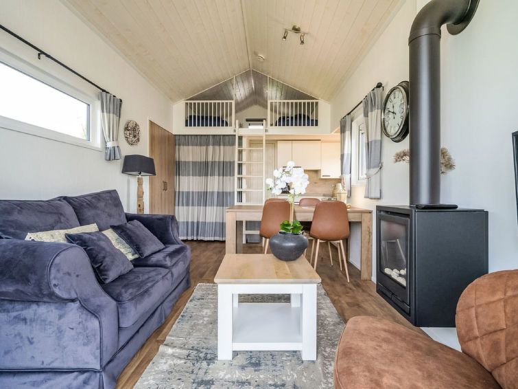 "Tiny Lodge 4", 2-room chalet 30 m2 on 2 levels. Comfortable furnishings: living/dining room with dining table, flat screen and gas heater. Exit to the terrace. 1 double bedroom with curtain with 2 beds. Open kitchen (4 hot plates, kettle, electric coffee machine). Shower/WC. Upper floor: (ladder) mezzanine with 2 beds.