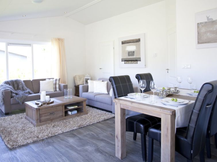 "Carré Nouveau 4", 3-room bungalow 65 m2. Spacious, beautiful and cosy furnishings: living/dining room with dining table and TV. Exit to the terrace. 1 room with 1 double bed. 1 room with 2 beds. Open kitchen (dishwasher, Gas stove, kettle, freezer, electric coffee machine, combination microwave).