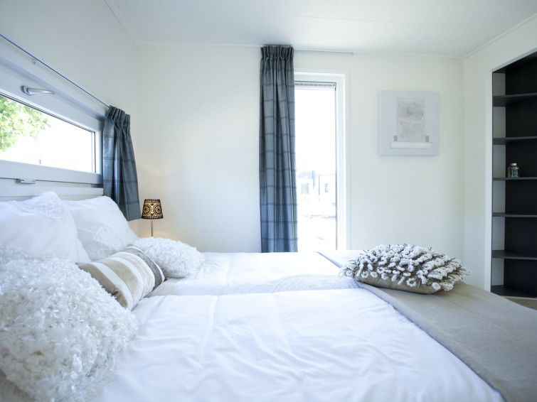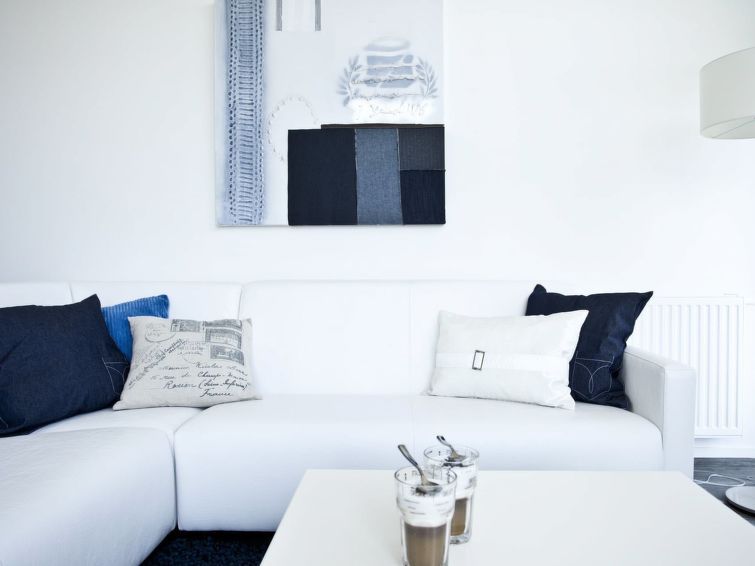 "L-Cube 4", 3-room bungalow 65 m2. Spacious and bright, tasteful furnishings: living/dining room with open-hearth fireplace, dining table and TV. Exit to the terrace. 2 rooms, each room with 2 beds. Kitchenette (dishwasher, 4 induction hot plates, kettle, freezer, electric coffee machine, combination microwave).