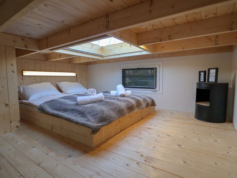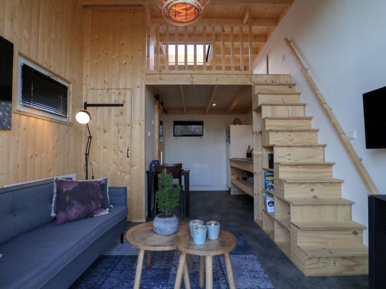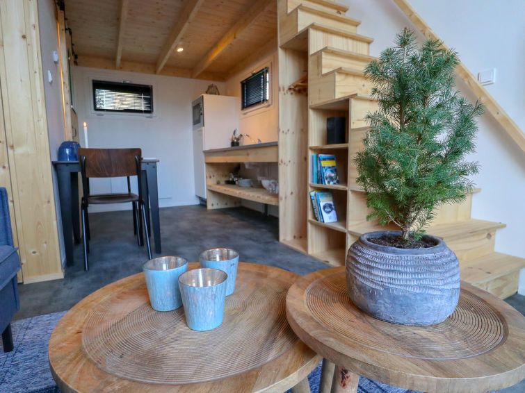 "Tiny House 2", 1-room house 18 m2 on 2 levels. Bright, practical and wooden furniture furnishings: living/sleeping room with dining table, TV and heating stove. Kitchenette (dishwasher, kettle, freezer, electric coffee machine, combination microwave). Shower/WC. Upper floor: (steep stair) open gallery with 1 double bed.