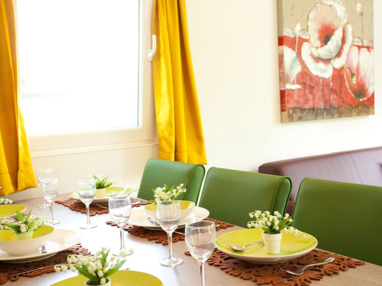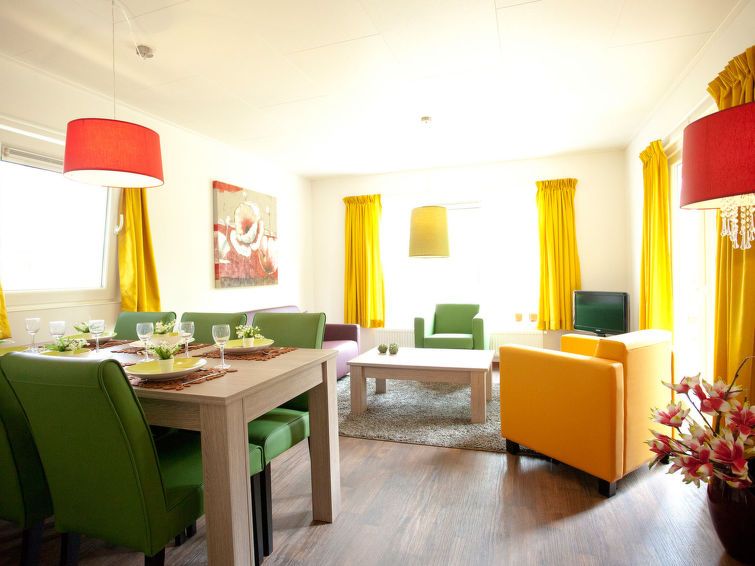 "Unique 6", 4-room bungalow 65 m2. Practical and cosy furnishings: living/dining room with dining table and TV. 2 rooms, each room with 2 beds. 1 room with 1 double bed. Kitchenette (dishwasher, 2 induction hot plates, Gas stove, 2 gas rings, kettle, freezer, electric coffee machine, combination microwave).