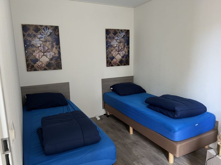 "L-Pavilion 6", 4-room bungalow 65 m2. Beautiful and cosy furnishings: living/dining room with dining table and TV. Exit to the terrace. 3 rooms, each room with 2 beds. Open kitchen (dishwasher, 2 gas rings, kettle, freezer, electric coffee machine, combination microwave). Shower/WC.