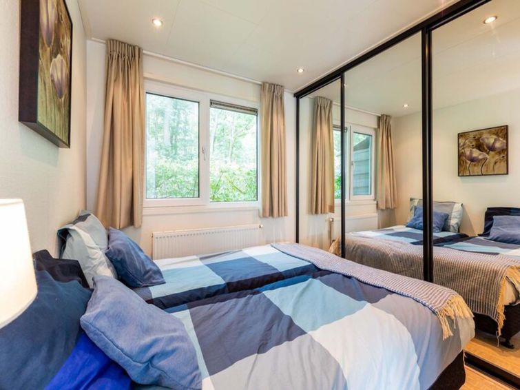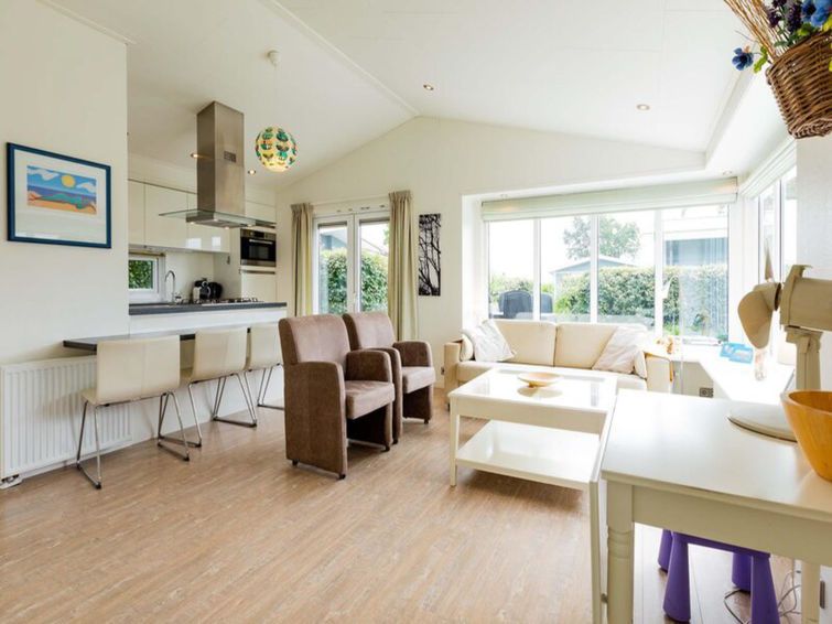 "Deluxe 4 personen", 3-room chalet. Comfortable furnishings: living/dining room with dining table and TV. Exit to the terrace. 1 room with 1 double bed. 1 room with 2 beds. Open kitchen (dishwasher, Gas stove, kettle, electric coffee machine, combination microwave). Shower/WC. Heating.