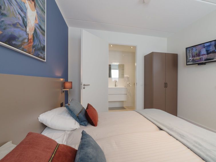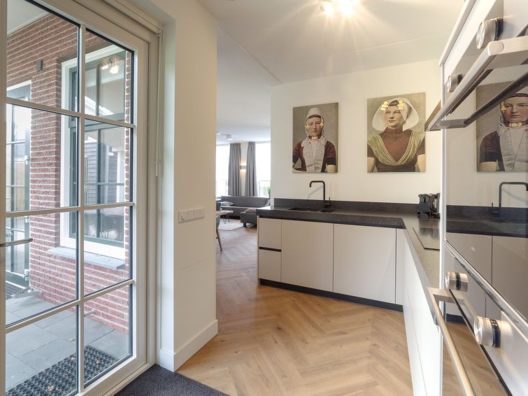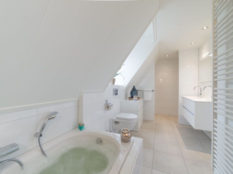 "8-persoons", 5-room house 126 m2 on 2 levels. Comfortable furnishings: living/dining room with dining table and flat screen. Exit to the terrace. 1 room with 2 beds (90 cm, length 210 cm), TV. Open kitchen (oven, dishwasher, 4 induction hot plates, kettle, microwave, electric coffee machine, Capsules for coffee machine (Nespresso-not incl.
