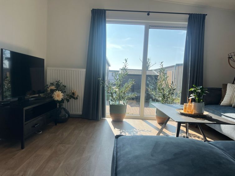 "De Zeebaars", 3-room chalet 52 m2. Comfortable furnishings: living/dining room with dining table and flat screen. 1 room with 1 double bed. 1 room with 1 x 2 bunk beds, 1 pull-out bed. Open kitchen (dishwasher, 4 induction hot plates, electric coffee machine, combination microwave).