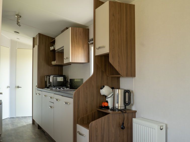 "Sunset", 4-room mobile home 60 m2. Comfortable furnishings: living/dining room with dining table and TV. Exit to the terrace. 1 room with 1 double bed. 2 rooms, each room with 2 beds. Small kitchen (4 hot plates, kettle, microwave, electric coffee machine). Shower/WC. Heating. Terrace.