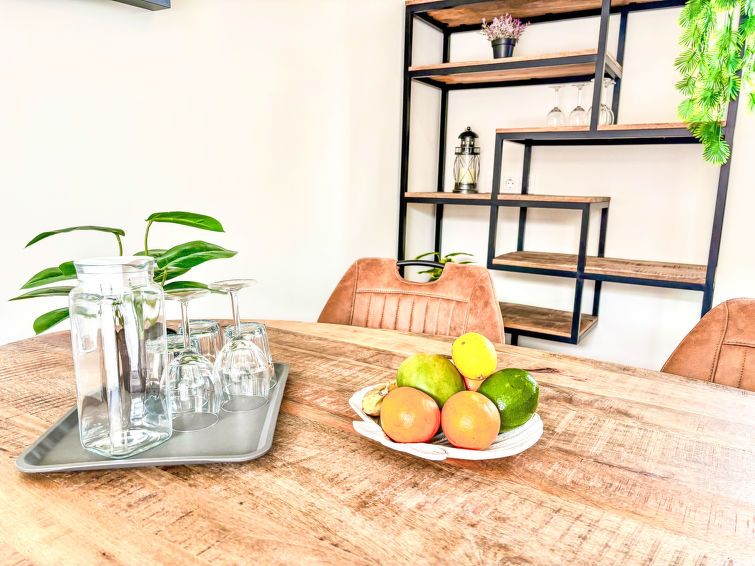"Beach House Westkapelle 2B", 3-room house. Comfortable furnishings: living/dining room with dining table and cable TV. Exit to the terrace. Open kitchen (oven, dishwasher, 4 induction hot plates, toaster, kettle, microwave, freezer, electric coffee machine). Shower/WC. Heating. Upper floor: 2 rooms, each room with 2 beds (80 cm, length 200 cm), air conditioning.