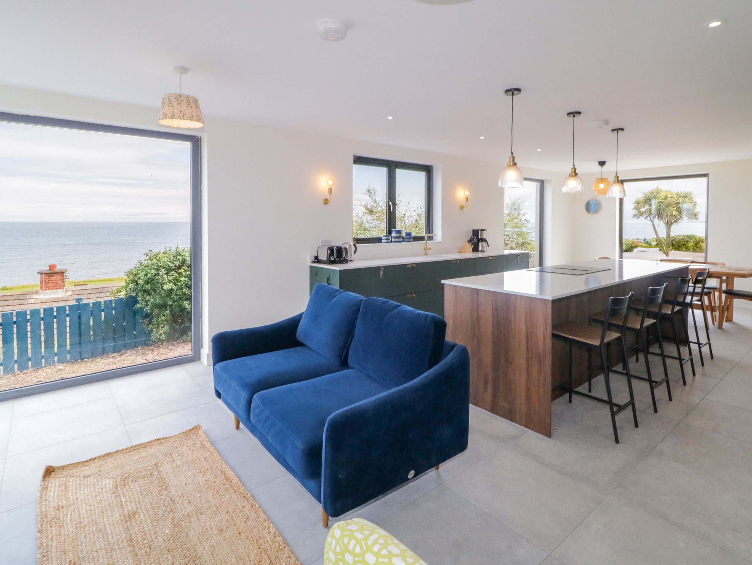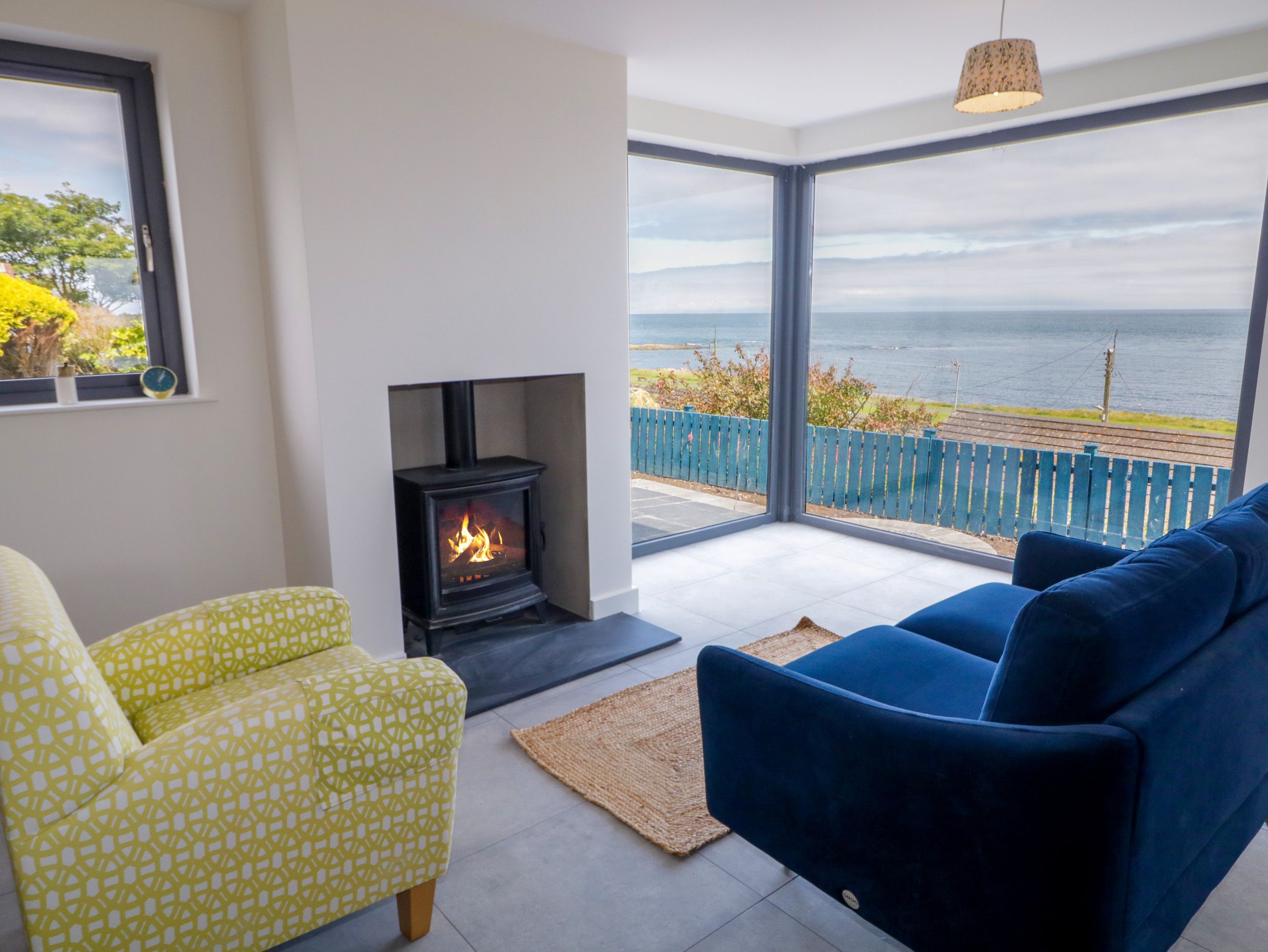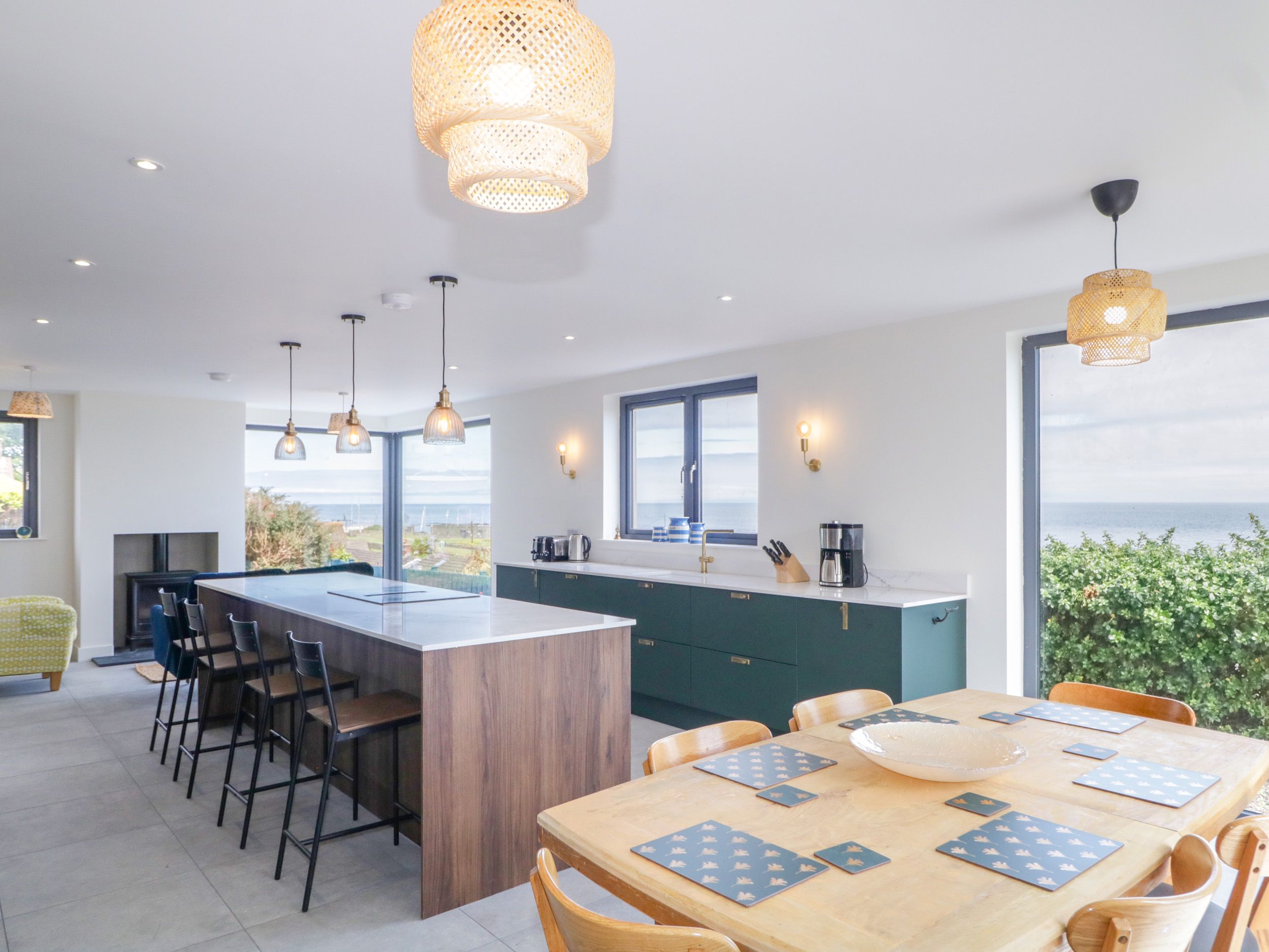 Holiday home Sea and Sky consists of living space with dining table for six, breakfast bar for four, electric oven and hob, washing machine, tumble dryer, dishwasher, microwave, kettle, toaster, coffee maker, fridge/freezer, and sitting area with woodburning stove. Snug with Smart TV, game room with Smart TV & table football. Ground-floor cloakroom. Bedrooms consist of ; king-size with en-suite walk-in shower, another king, trundle (pull-out bed), and child's bunk. Bathroom with freestanding bath, shower over, WC, heated towel rail, and basin. Highchair and stairgate available. Enclosed rear patio with furniture, fire pit, BBQ. Off-road parking for two. 1 x dog welcome. No smoking. WiFi, fuel, power, linens and towels included. Good Housekeeping Bond of £250. Dogs only allowed downstairs. Multi-level lawn and patio, please take care. This property can only accept 1 booking per week. This property can accommodate up to 5 adults and an additional 3 children or teens, due to the bed configuration