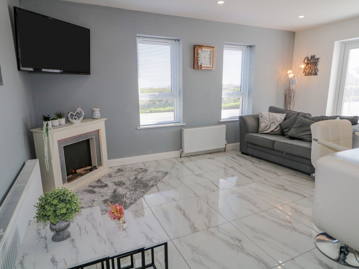 Accomodation Details Four bedrooms: 1 x ground floor superking size with TV and en suite walk in shower, basin and WC & 1 x double (bathroom next door). First floor: 1 x double with TV and en-suite walk-in shower, basin and WC, 1 x super king with en-suite walk in shower, basin and WC & TV. Ground-floor bathroom with roll-top bath, walk-in shower, double basins and WC. Open-plan living space with kitchen, dining area and sitting area. Utility. Sitting room