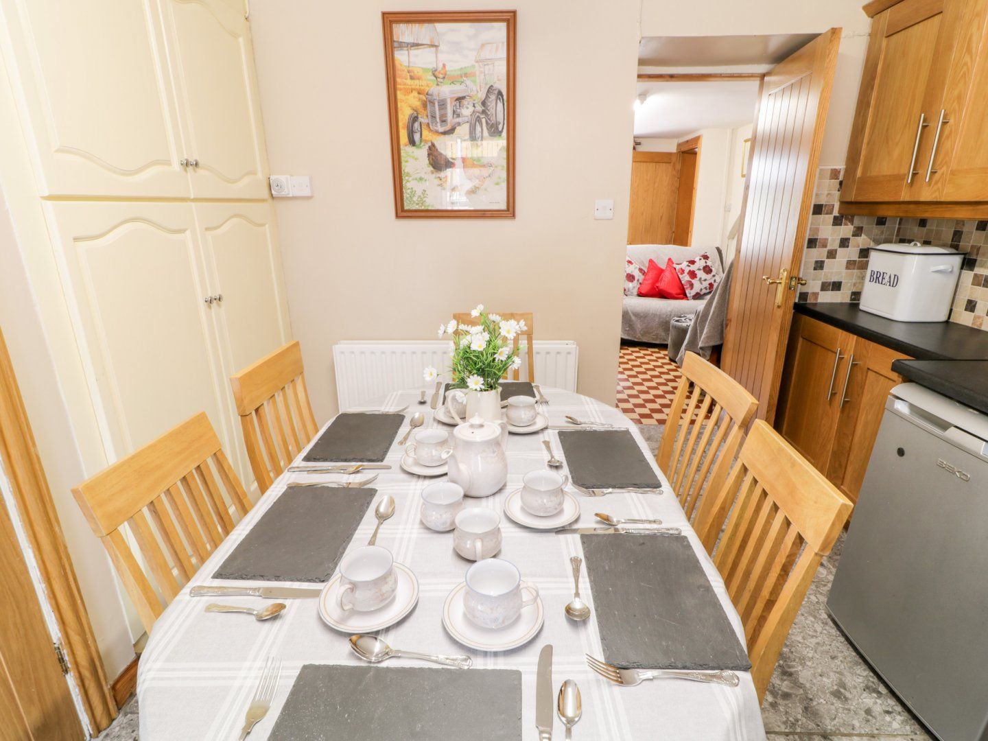 Amenities Central heating. Electric oven and hob, airfryer, AGA, microwave, fridge, freezer, washing machine, dishwasher. Smart TV, WiFi. Fuel and power inc. in rent. Bed linen and towels inc. in rent. Travel cot and highchair available. Ample off-road parking available. Private rear garden with patio, furniture and barbecue. Outdoor cabin for outdoor entertainment with seating area and a fridge/freezer for drinks/food when dining outdoors. Two well-behaved pets welcome. An out door kennel is available. The property is located on a working farm, dogs must be kept on a lead, there is no access to the surrounding farm land. Sorry, no smoking. Shop 2.5 miles, pub 2.1 miles. Holistic therapies including; reflexology, sports massage and deep tissue cupping can be booked in with the owner. Note: 2 big steps leading down to the back door from outside. Note: Staircase is steep, please take care. Note: At the end of the patio is a drop which has been marked off by Hazard tape by the Owner. Note: the property can sleep up to 7 people please call reservations for further information