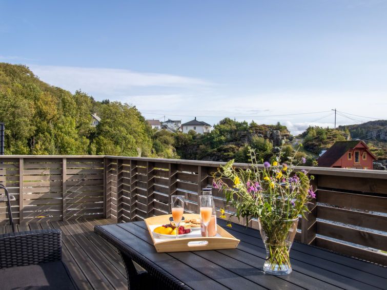 "Torsk", 7-room semi-detached house 100 m2 on 3 levels. Modern and cosy furnishings: living room with cable TV (flat screen), radio and CD-player. Exit to the terrace. 2 rooms, each room with 1 bed (90 cm, length 200 cm). Shower/WC. Underfloor heating. Upper floor: living/dining room with dining table.