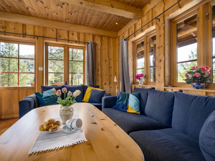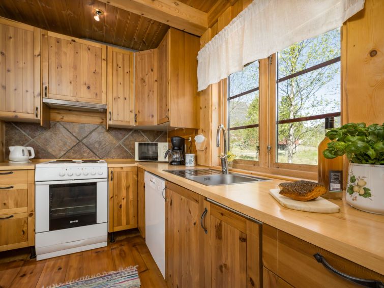 "Myravatnet", 4-room house 98 m2 on 2 levels. Cosy and wooden furniture furnishings: living/dining room with Scandinavian wood stove, dining table, satellite TV, international TV channels and DVD. Exit to the terrace. 2 rooms, each room with 1 double bed (150 cm, length 200 cm). Open kitchen (4 hot plates, oven, dishwasher, toaster, kettle, freezer, electric coffee machine).