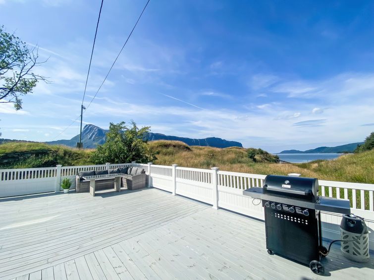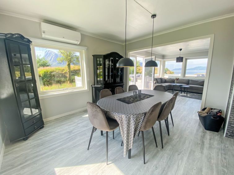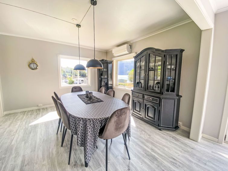 "Sjøtun", 5-room house 116 m2 on 2 levels. Bright, comfortable and beautiful furnishings: living/dining room with Scandinavian wood stove, dining table and TV. Exit to the terrace. Open kitchen (oven, dishwasher, 4 ceramic glass hob hotplates, microwave, freezer, electric coffee machine).