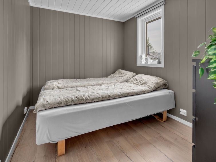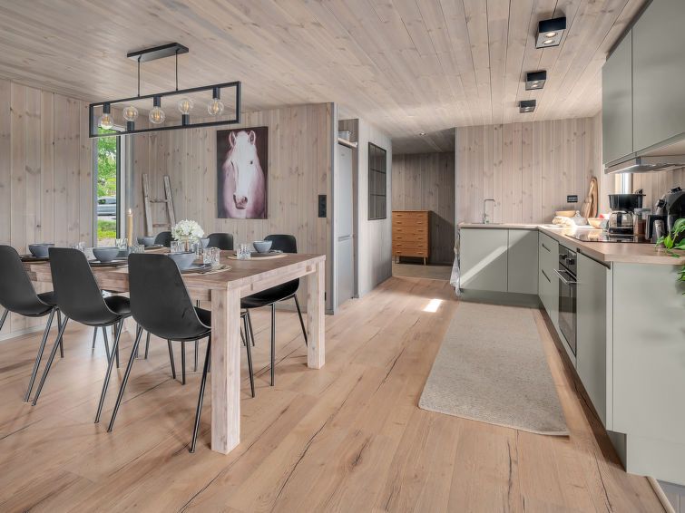 "Bjørkstue", 5-room house 80 m2. Cosy furnishings: living/dining room with Scandinavian wood stove, dining table and TV. Exit to the terrace. 1 room with 1 double bed (160 cm, length 200 cm). 1 room with 1 x 2 bunk beds (120 cm, length 200 cm) (80 cm, length 200 cm). 1 room with 1 x 2 bunk beds (120 cm, length 200 cm) (75 cm, length 200 cm).