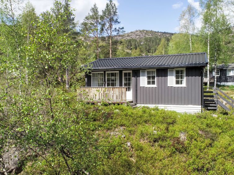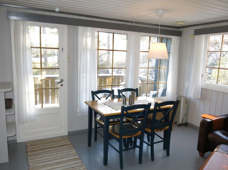 "Thorabu", 3-room house 40 m2. Cosy and wooden furniture furnishings: living/dining room with Scandinavian wood stove and dining table. Exit to the terrace. 1 room with 1 x 2 bunk beds (80 cm, length 200 cm), 1 double bed (140 cm, length 200 cm). 1 room with 1 x 2 bunk beds (80 cm, length 200 cm).