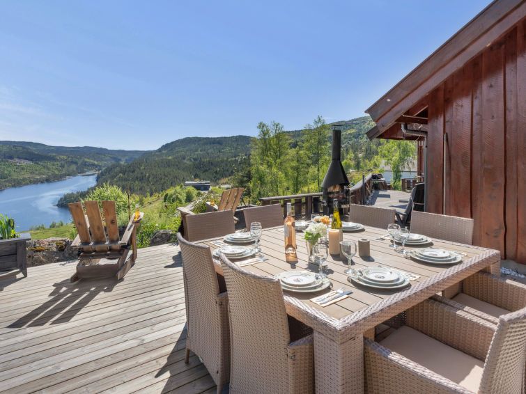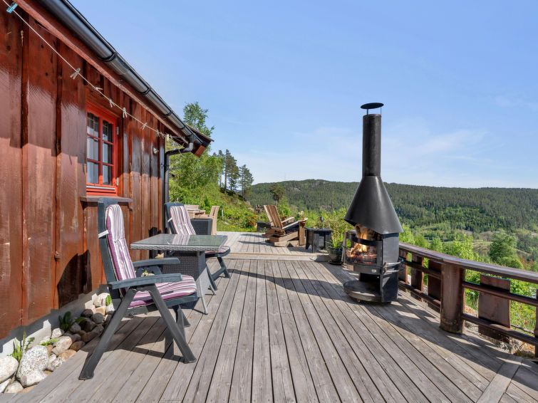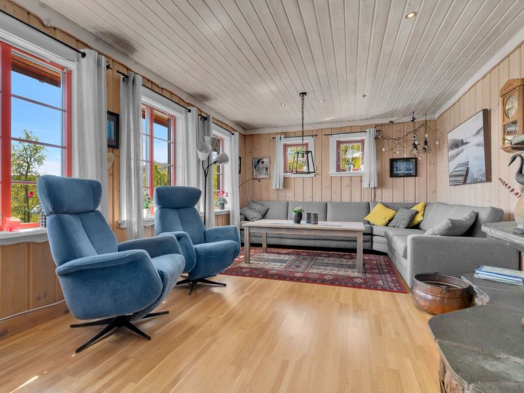 "Trondbu", 7-room house 110 m2 on 2 levels. Cosy and wooden furniture furnishings: living room with Scandinavian wood stove, satellite TV and DVD. Exit to the terrace. Living room with winter garden with satellite TV and DVD. Open kitchen (oven, dishwasher, 4 ceramic glass hob hotplates, microwave, freezer, electric coffee machine) with dining table.