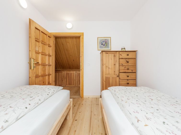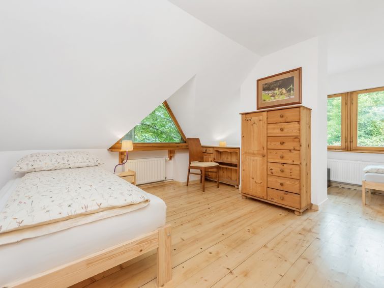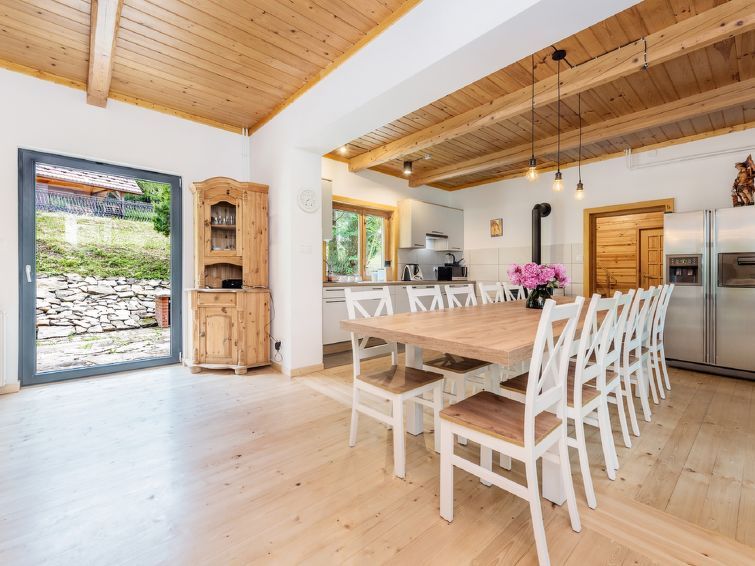 5-room chalet 180 m2 on 2 levels. Stylish and cosy furnishings: living/dining room with 1 sofabed, open-hearth fireplace and TV. Exit to the garden, to the terrace. 1 room with 1 double bed (160 cm). Open kitchen (oven, dishwasher, 4 ceramic glass hob hotplates, microwave, freezer) with dining table.