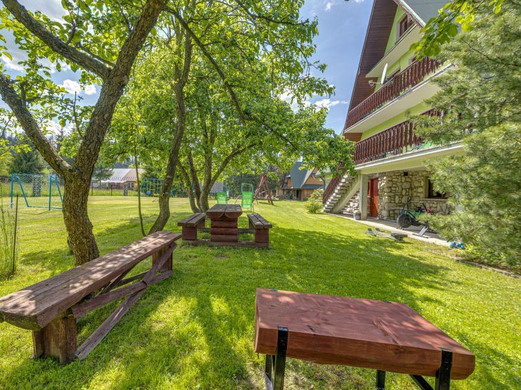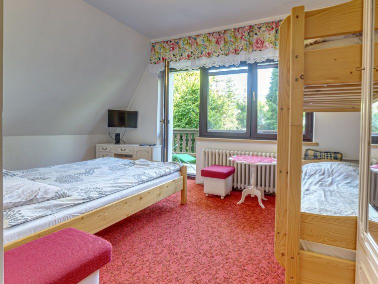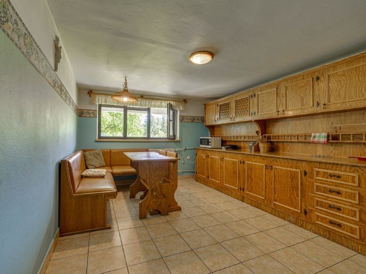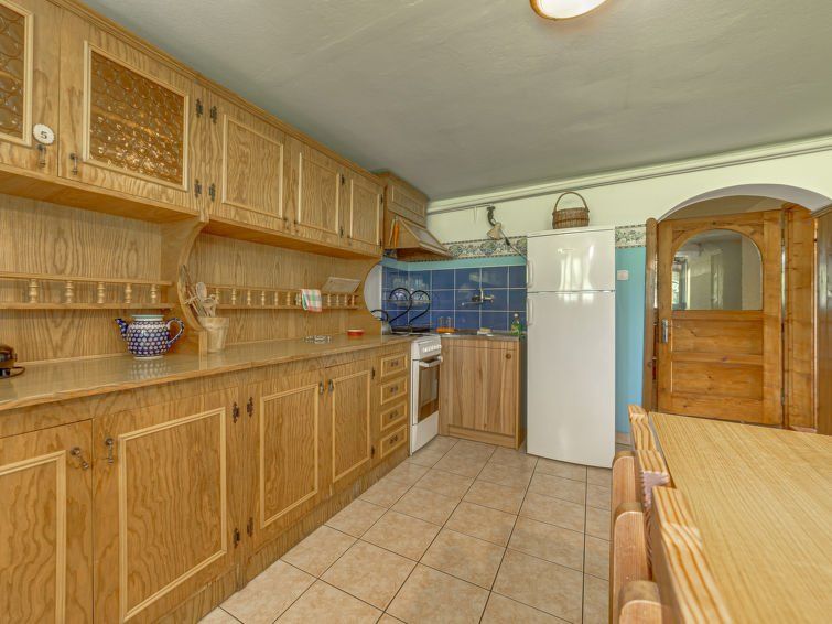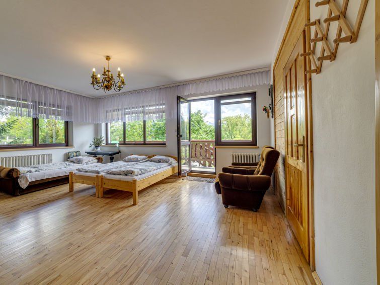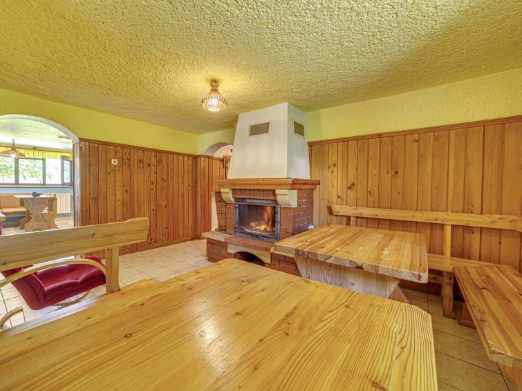 5-room apartment 100 m2 on 2 levels. Open dining room with open-hearth fireplace. Large kitchen (4 hot plates) with dining table, radio. Upper floor: 1 room 9 m2 with 1 french bed (150 cm). Interconnecting room 30 m2 with 2 beds (90 cm), 1 double sofabed, shower/WC and satellite TV.