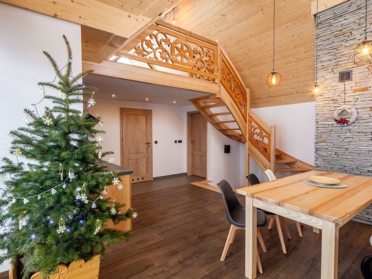 "Lilia", 3-room chalet 120 m2 on 2 levels. Partly with sloping ceilings, comfortable furnishings: open gallery with 2 beds, 1 sofabed and flat screen. Open kitchen (dishwasher, 2 ceramic glass hob hotplates, electric coffee machine) with dining table. Shower/WC. Electric heating. Upper floor: 1 room with 1 double bed and shower/WC.