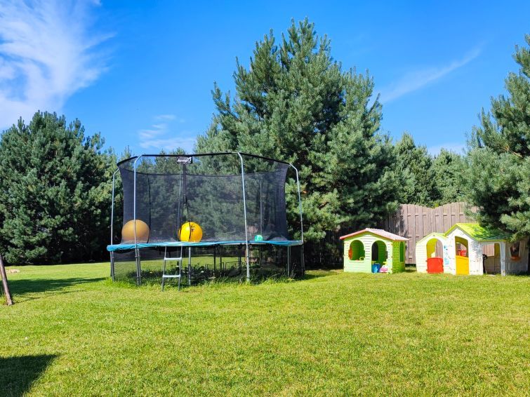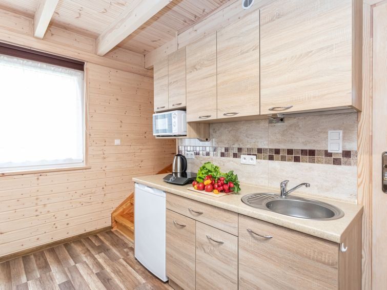 "Domek dla 6 osób", 3-room house 56 m2 on 2 levels. Comfortable and cosy furnishings: living/dining room with 1 sofabed. Exit to the garden, to the terrace, to the swimming pool. Kitchenette (1 induction hot plates, microwave) with dining table and dining nook. Shower/WC. Boiler (50 litres).