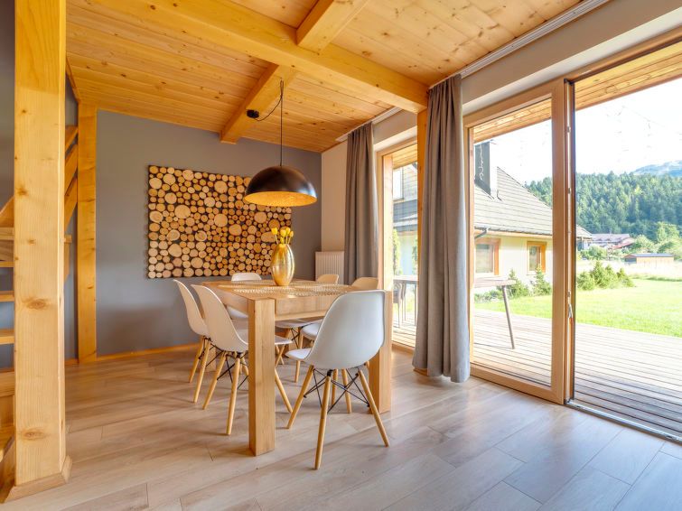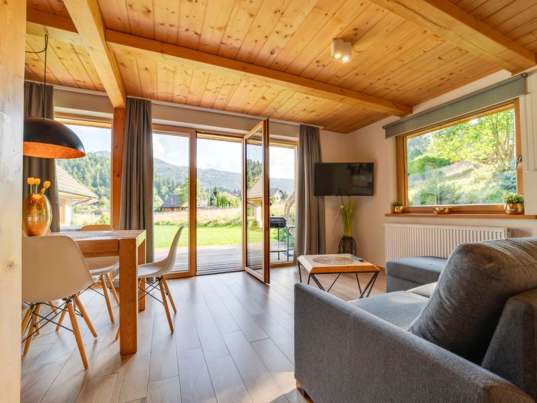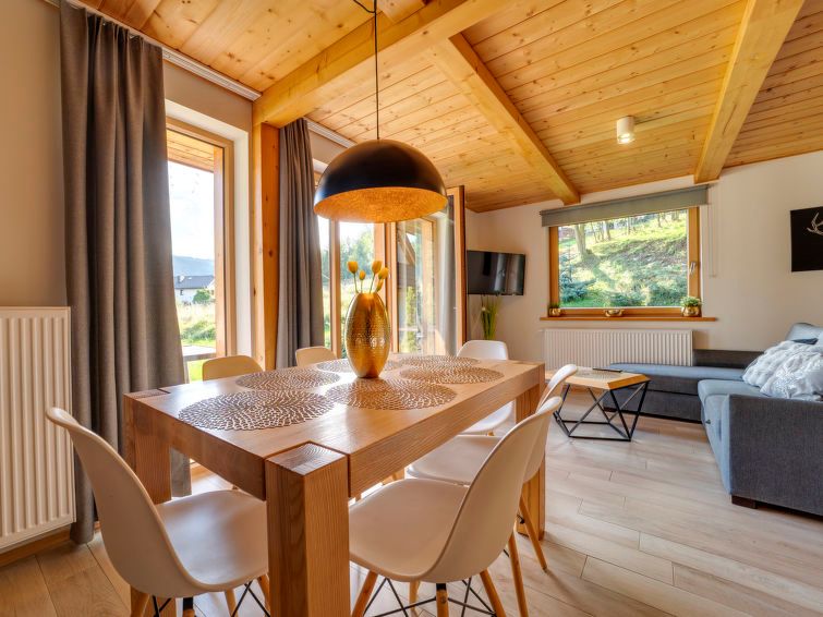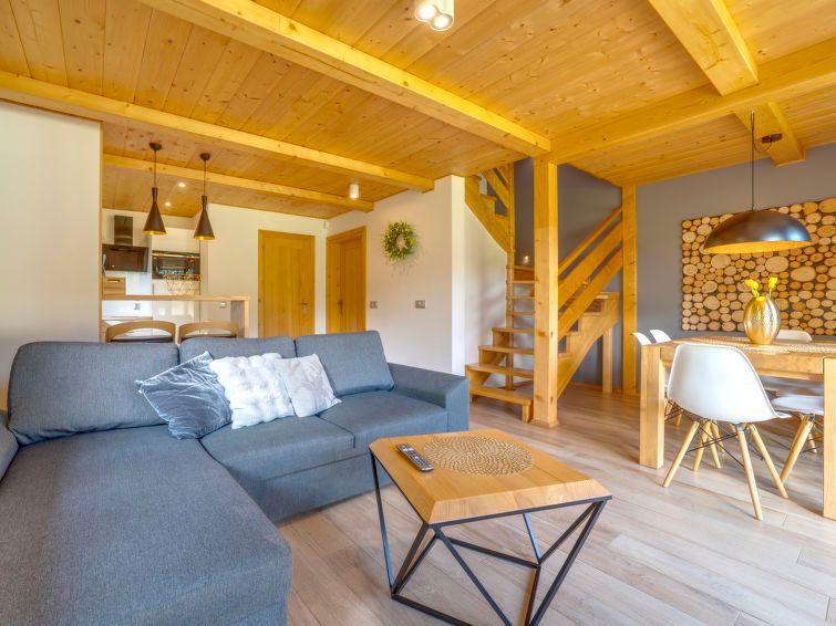 3-room chalet 70 m2 on 2 levels. Partly with sloping ceilings: lounge with 1 double sofabed, dining table and TV. Exit to the terrace. Open kitchen (dishwasher, 2 ceramic glass hob hotplates, microwave, freezer). Sep. WC. Upper floor: 1 room with 1 bed (80 cm, length 200 cm), 1 double bed (140 cm, length 200 cm).