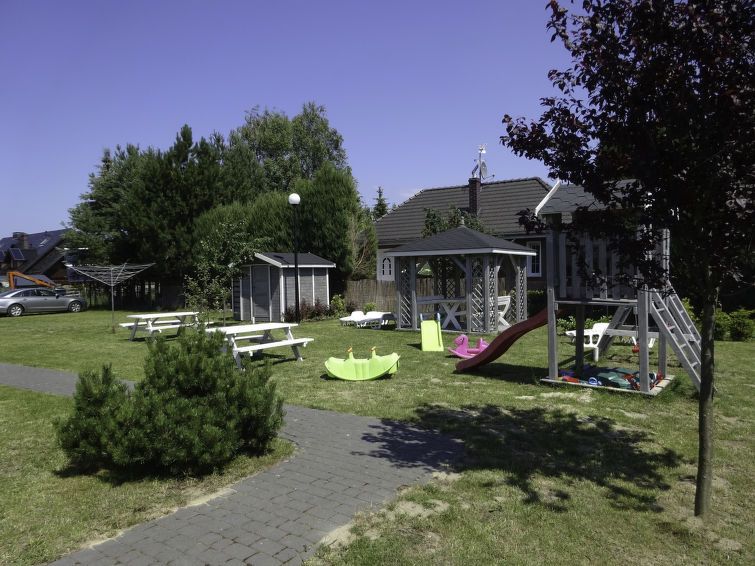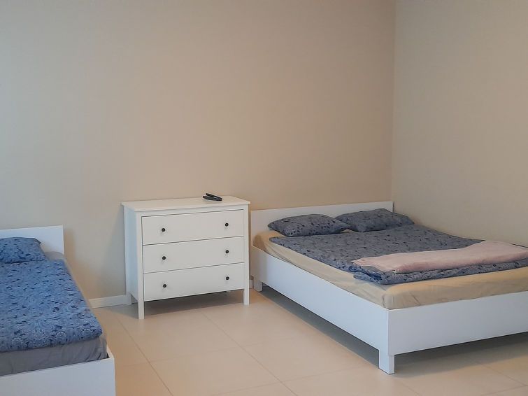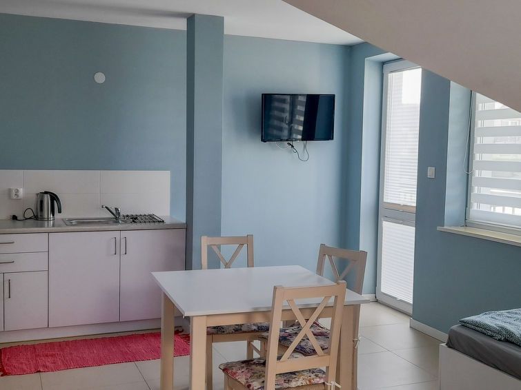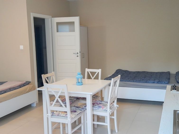 1-room apartment 32 m2, on the ground floor. Comfortable and stylish furnishings: living/dining room with 2 beds (90 cm, length 200 cm), 1 french bed (140 cm, length 200 cm), hand-basin, shower/WC and satellite TV. Exit to the garden. Open kitchen (2 ceramic glass hob hotplates) with dining table.