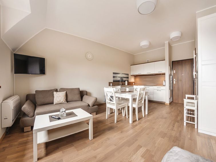 "Sun & Snow 4 people", 2-room apartment 36 to 43 m2. Living/sleeping room with 1 sofabed and satellite TV. 1 room with 1 double bed. Open kitchen (dishwasher, 1 induction hot plates, kettle, microwave). Shower/WC. Heating, gas heating. Facilities: iron, hair dryer. Internet (WiFi).