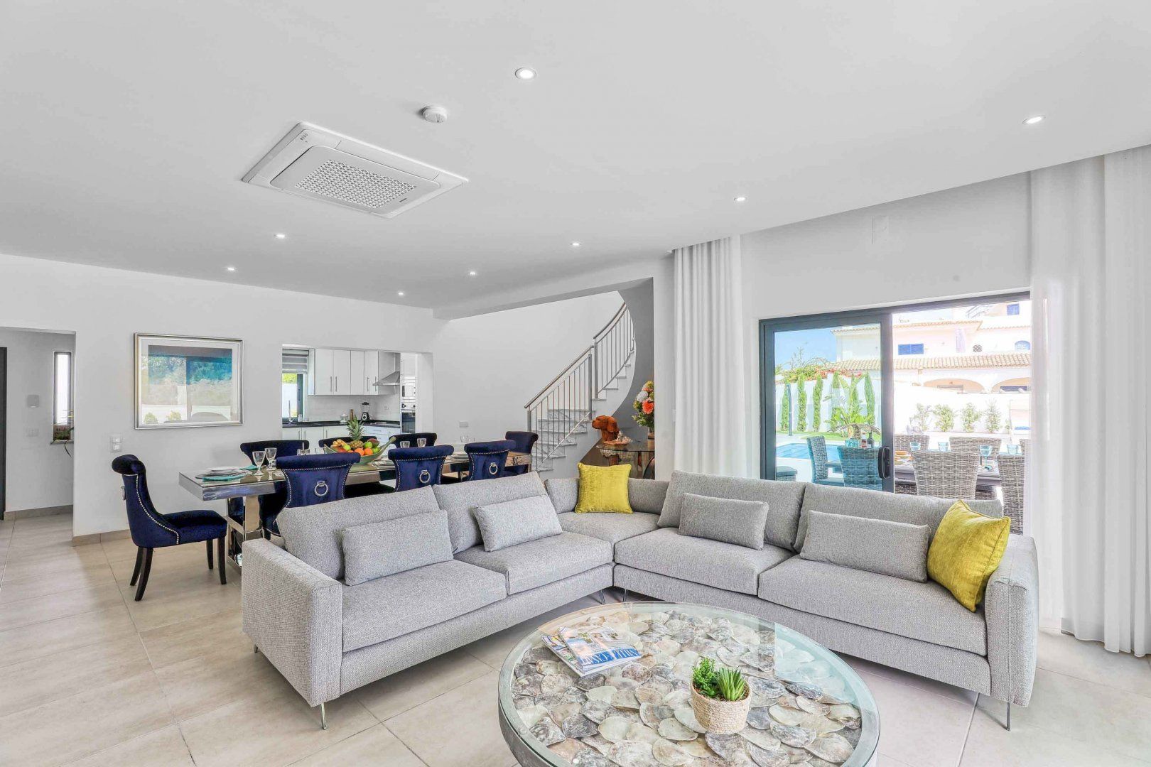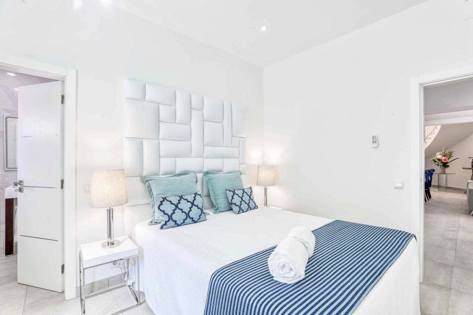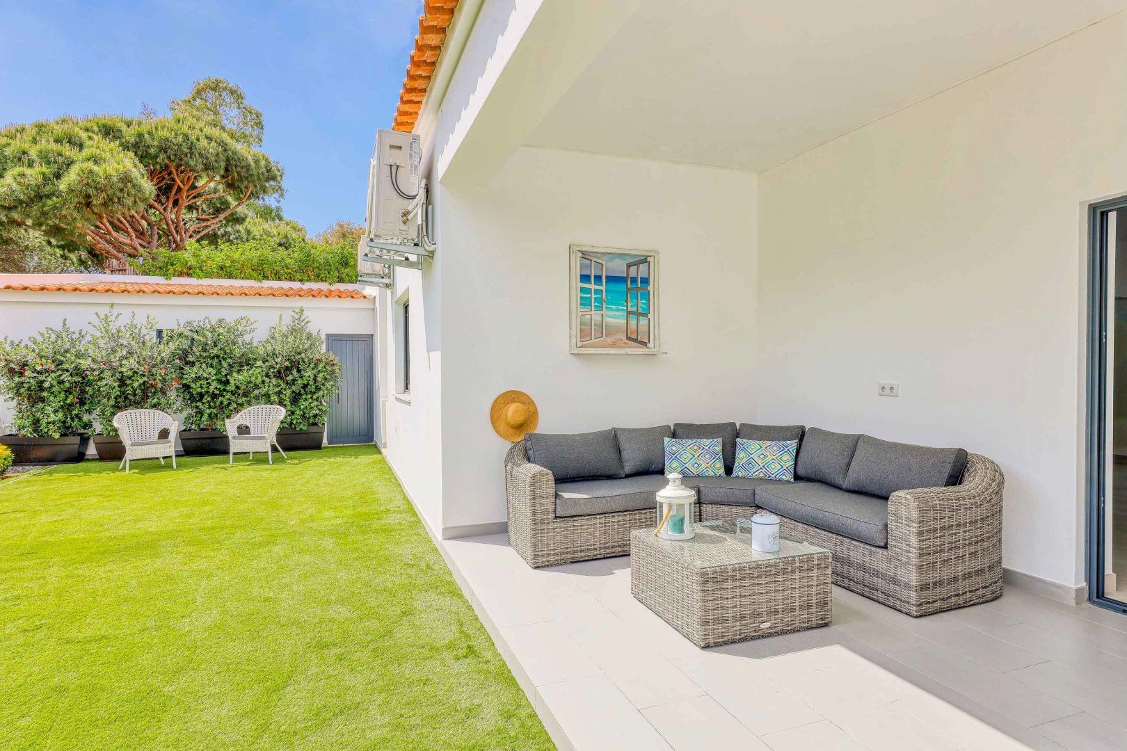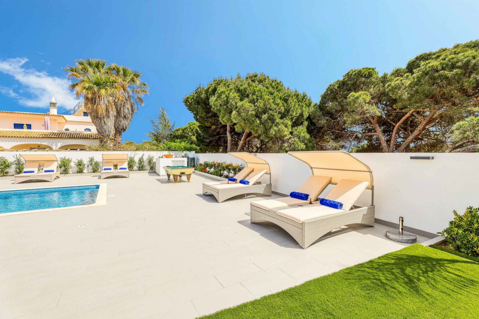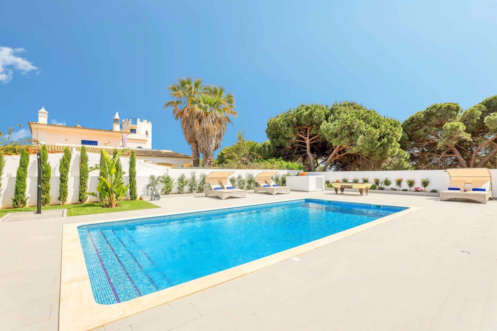 Located right at the heart of Albufeira, this villa is pretty impressive. The popular beaches of Castelo and Evaristo are within walking distance – as are plenty of shops and eateries – but this home has more going for it than just location. There’s heaps of room for a group, including a second lounge upstairs that would be ideal for kids to claim as their own – they’ll also have table tennis and a pool table to keep them entertained. Outside, the choice of covered terraces, quiet balconies, and poolside daybeds will appeal to those wanting a laid-back stay.