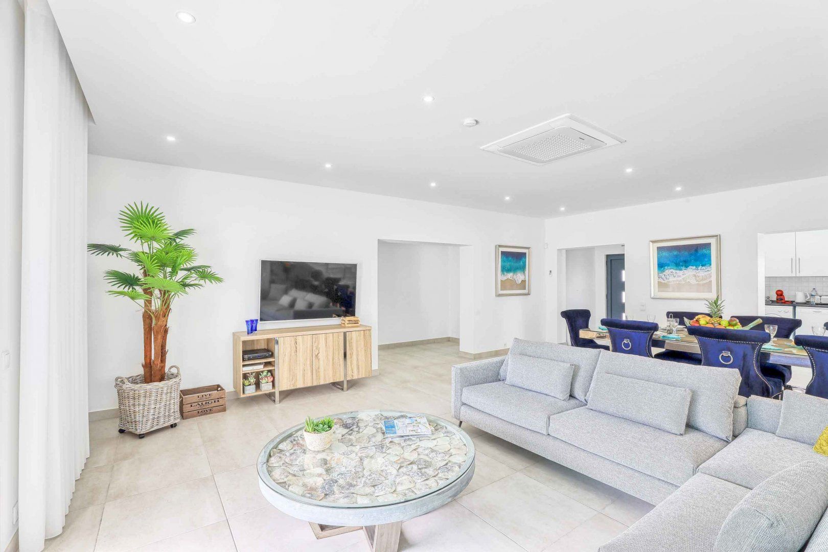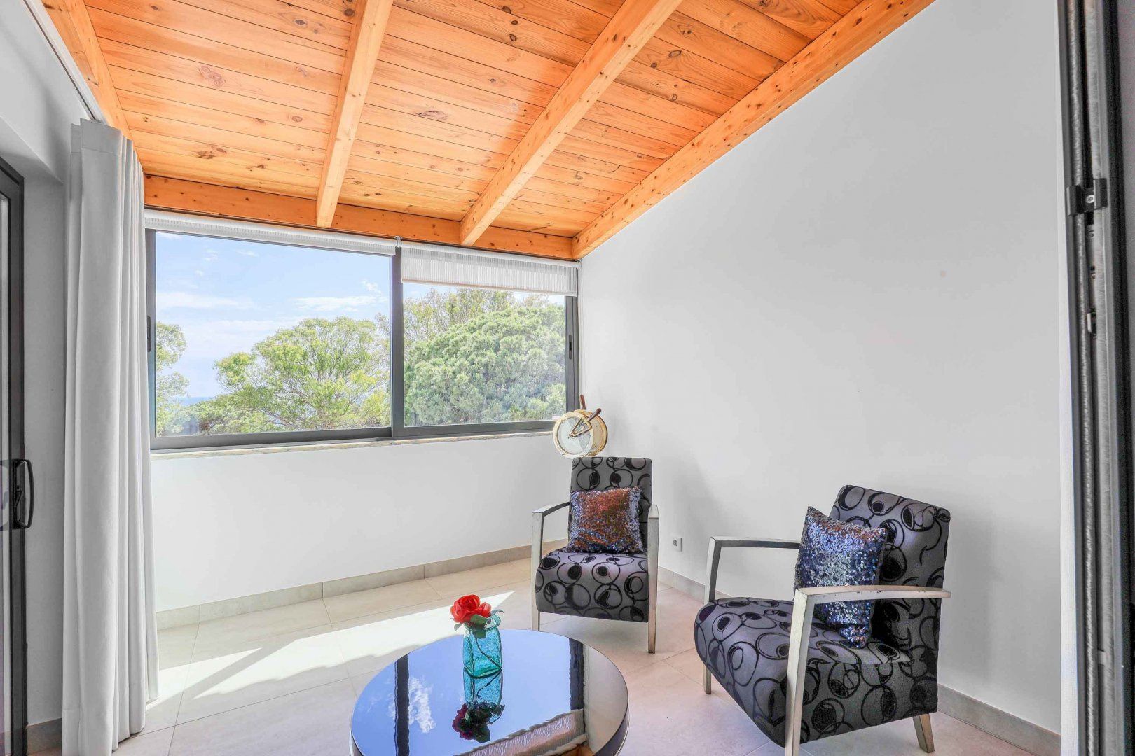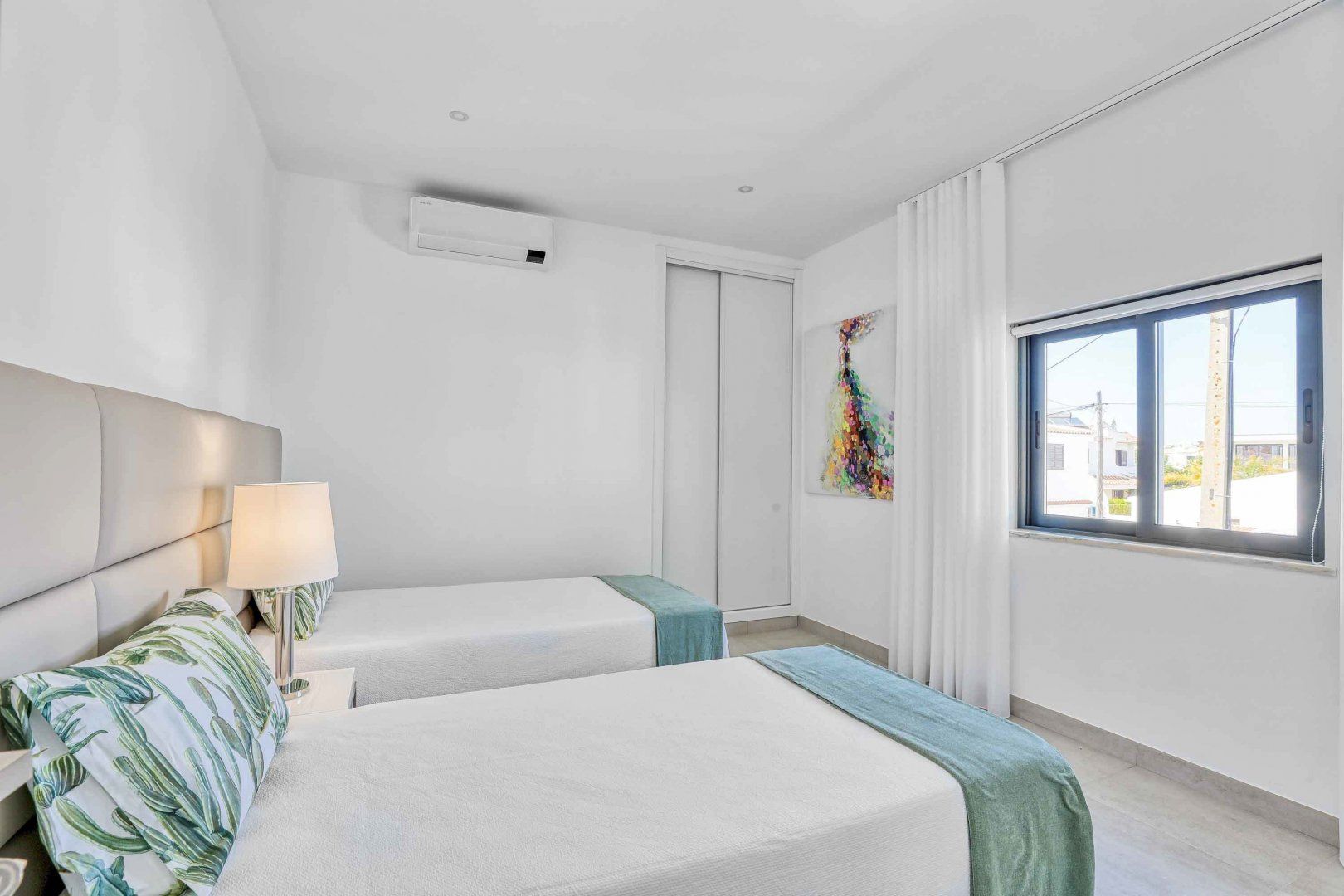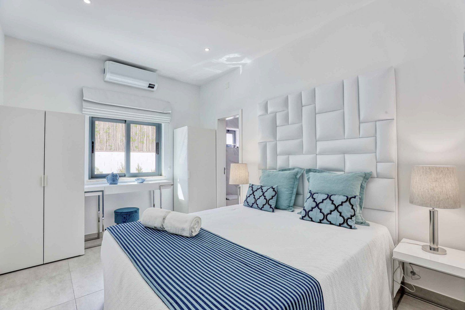 Located right at the heart of Albufeira, this villa is pretty impressive. The popular beaches of Castelo and Evaristo are within walking distance – as are plenty of shops and eateries – but this home has more going for it than just location. There’s heaps of room for a group, including a second lounge upstairs that would be ideal for kids to claim as their own – they’ll also have table tennis and a pool table to keep them entertained. Outside, the choice of covered terraces, quiet balconies, and poolside daybeds will appeal to those wanting a laid-back stay.